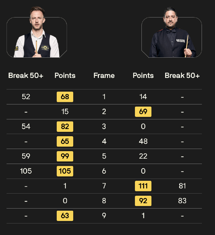 上半场特鲁姆普取得3-1的领先,并在中场休息后打出单杆105分连胜两局取得赛点,随后史蒂文斯连追两个赛点;第九局特鲁姆普多次上手取得胜利。全场比赛,特鲁姆普打出一杆破百(105)和三杆50+(52、54、59),史蒂文斯打出两杆50+(81、83)。