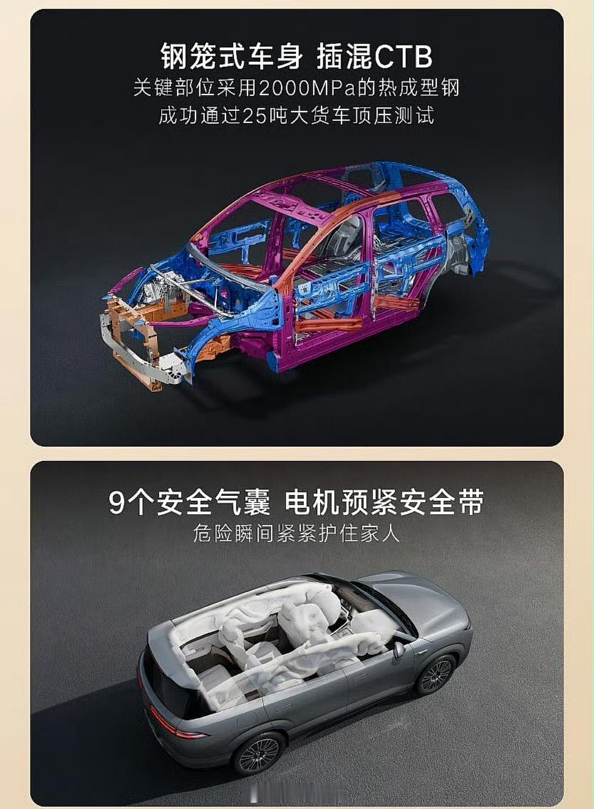 被动安全方面,车身关键区域采用2000MPa超高强度热成型钢,搭配混动CTB技术,大幅提升了车身刚性,官方测试中甚至能承受25吨大货车侧翻压顶,有效保护车内乘员的生存空间。同时,全车配备9个安全气囊,覆盖前排、第二排和第三排,碰撞发生时能最大限度降低伤害,给家人满满的安全感。