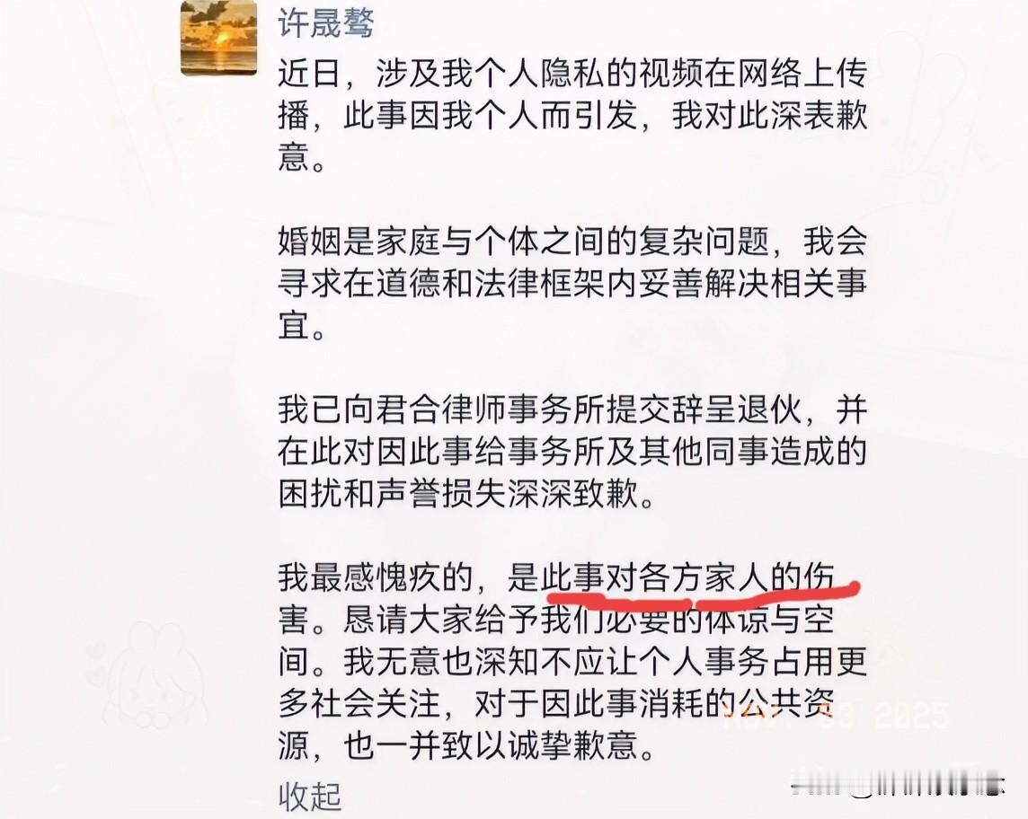 律师的道歉信能写成法律免责声明模板? 许晟骜这波操作堪称“危机公关中的精准拆弹”。 表面诚恳道歉,实则每句话都在法律红线内疯狂试探。 满屏"对不起各方家人",唯独跳过原配,律师朋友一语道破:离婚财产分割时,未白纸黑字承认的过错,法律上难认定赔偿义务。 那句“婚姻是复杂问题”更是话术精髓——用哲学口吻淡化出轨实质,不知道的还以为他在搞婚姻学术研讨。 退伙声明看似断臂求生,实则为律师证上保险,既保全职业资格,又给后续操作留足空间:若出轨视频再被爆料,反手就能以“侵犯隐私”追责,整套流程严丝合缝,把私人道德危机包装成职业风控案例。 当道歉信需要同行解码才能看懂时,所谓的诚意早已被算计消解,法律或许能规避条款,但人心自有量尺。