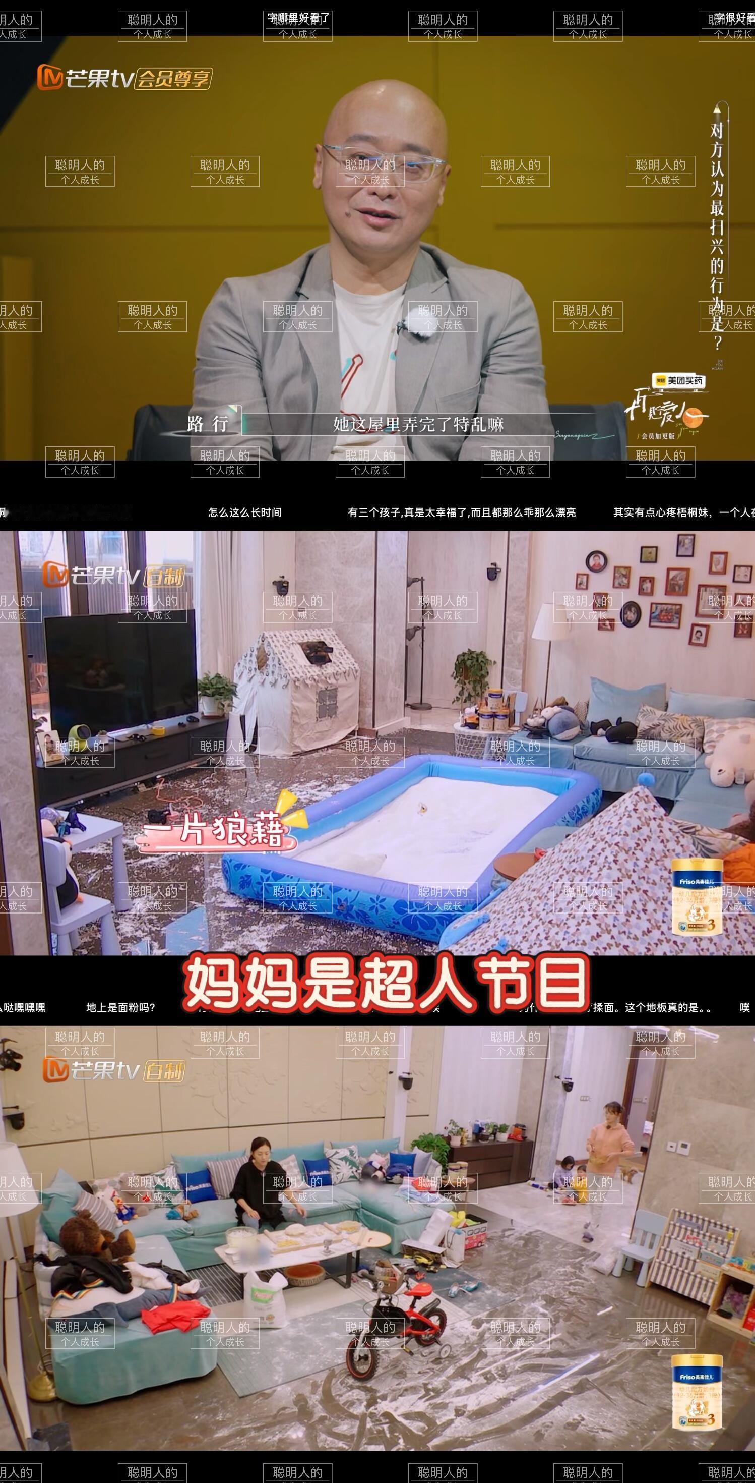 3️⃣ 邓莎带孩子比较松弛,会给孩子弄泡泡球模仿南极,包饺子也会带孩子一起。饺子他们来的那一期客厅都是面粉哈哈。