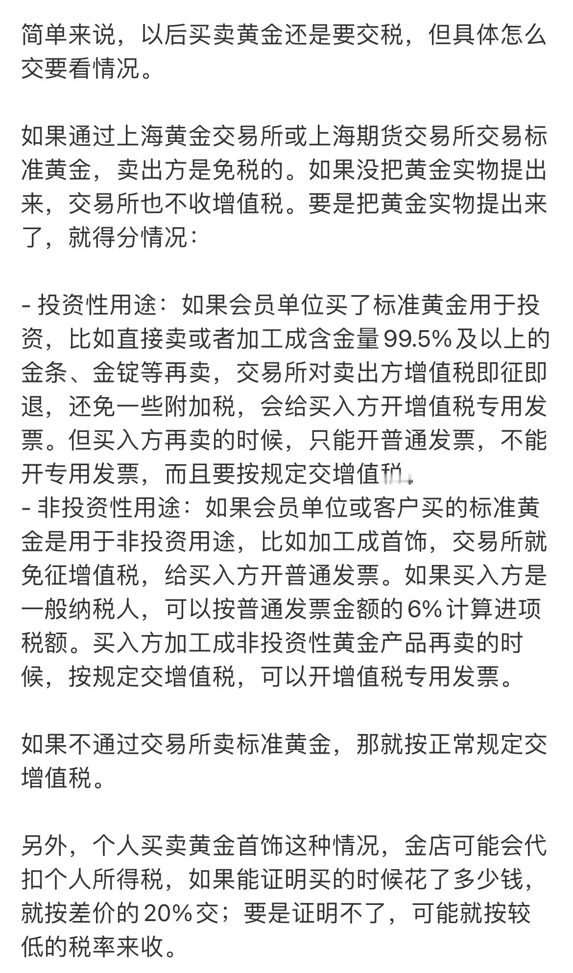 简而言之,自11月1日至2027年12月31日,通过上海黄金交易所、上海期货交易所交易的标准黄金(未实物交割)免征增值税,不过,一旦提取实物出库或在非交易所渠道销售,则按现行规定征收增值税。