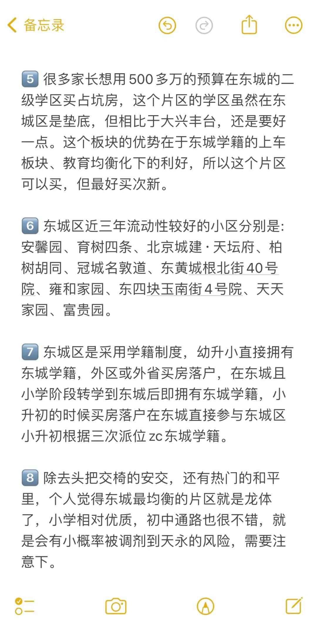 5️⃣ 很多家长想用500多万的预算在东城的二级学区买占坑房,这个片区的学区虽然在东城区是垫底,但相比于大兴丰台,还是要好一点。这个板块的优势在于东城学籍的上车板块、教育均衡化下的利好,所以这个片区可以买,但最好买次新。