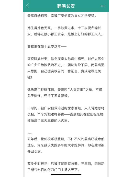 女主原本是个孤女,7岁被广安伯夫妇收养为义女,并且学到了一手好医术。但是15岁那年,义父被人陷害,在瘟疫救治中造成了皇太孙的死亡,女主原本是想帮义父证明清白,没想到被人设计反倒害了义父一家。女主被小郡王求情逃过一劫,并且一直在追查真相,但是也成了幕后主使的眼中钉,被烧伤了。女主被小师父救下,并且换脸了,一边学习武功一边一直在准备复仇。
