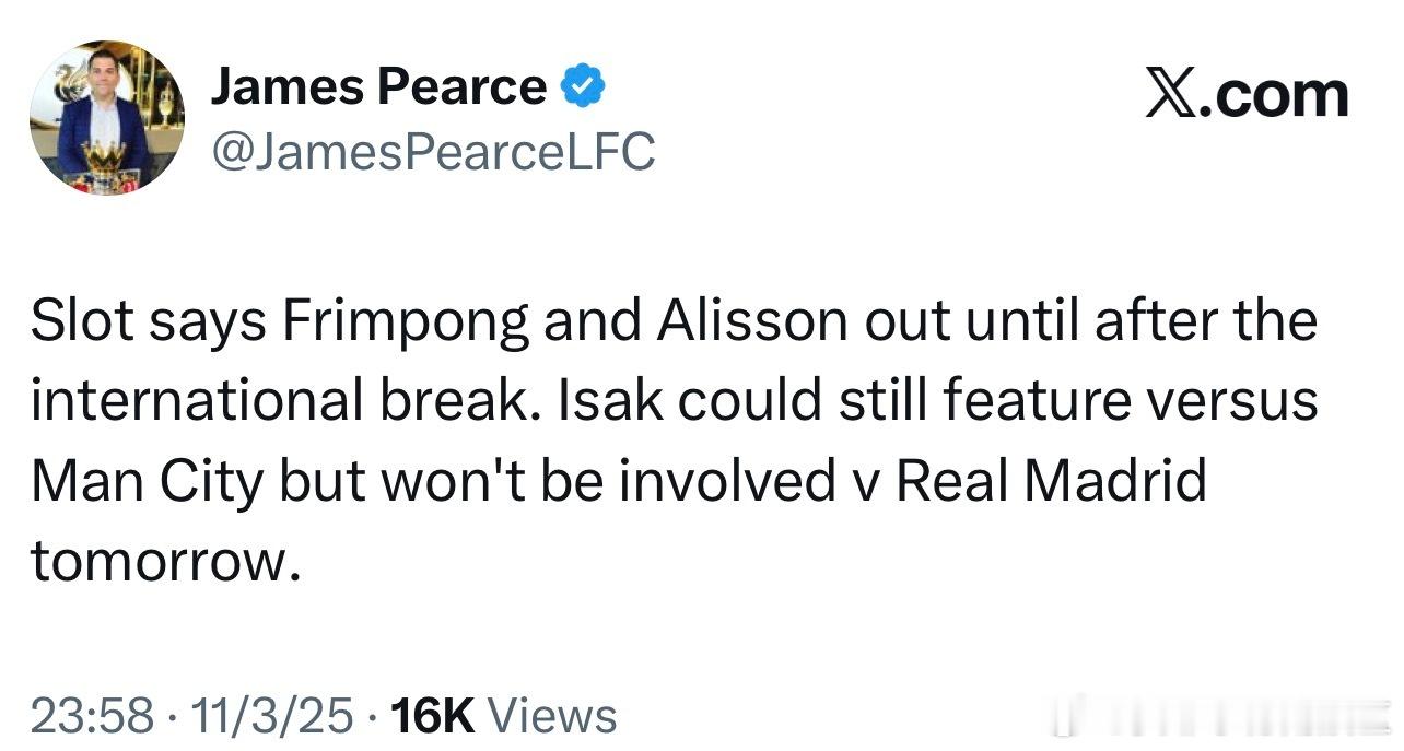 伊萨克的伤病应该是好的差不多了,明天的比赛不能踢但是没准可以进入对阵曼城的比赛大名单。琼斯已经回来参加训练了,弗林蓬和阿利森都会缺席到国家队比赛日之后