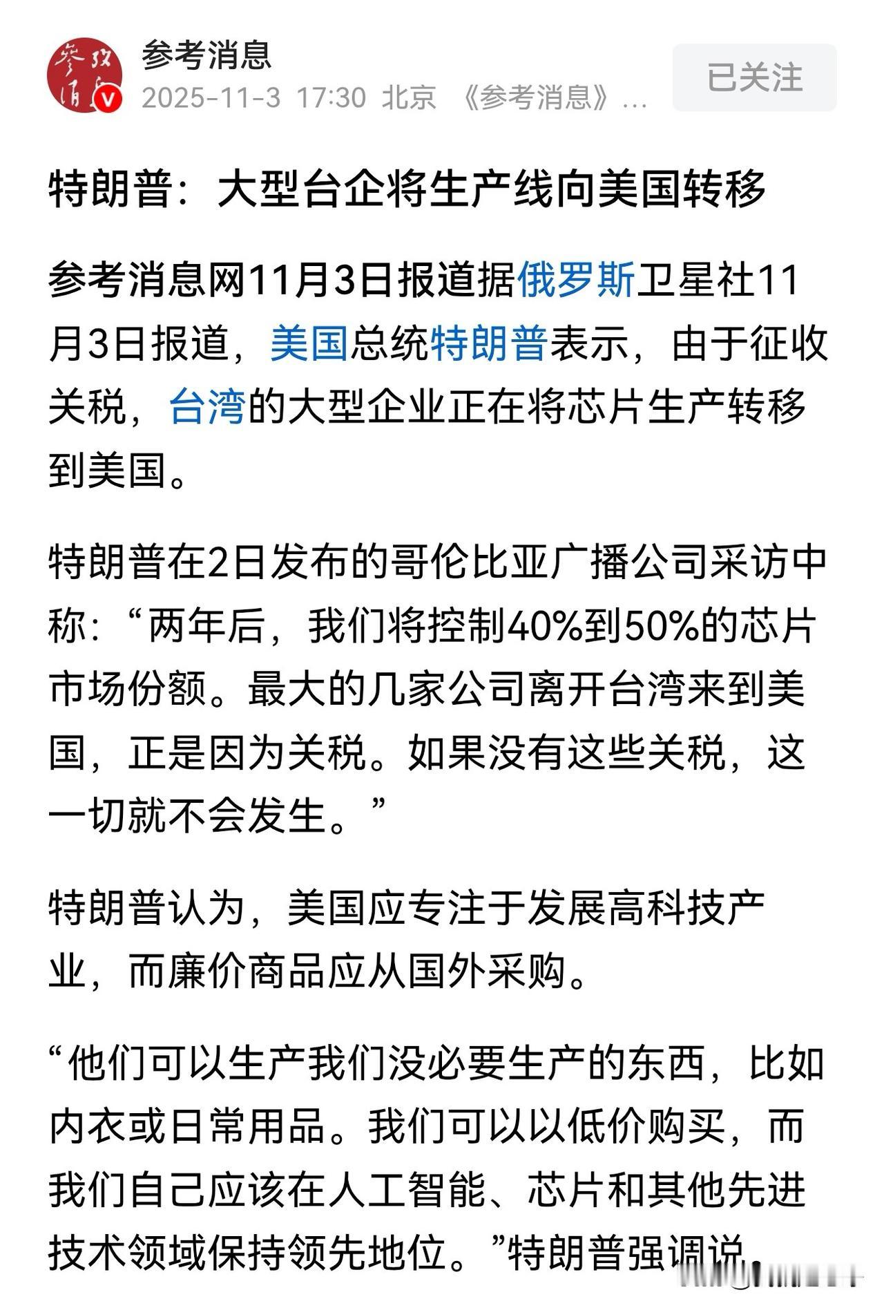已经到了最后一刻了吗?局势已经到了不可挽回的地步了吗?美国的判断这么悲观吗? 已经开始直接搬工厂了,这说明特朗普他们非常不看好局势。 他们已经做出了最悲观的判断,那就是台湾必丢。 11月3号特朗普对媒体表示,台湾的大型企业正在将芯片生产线转移到美国。 特朗普开始收割台湾最后的一批有价值的财富了。 对外宣传的口吻是,因为关税的问题。 但是这些都是借口而已。 关税品类那么多,为什么转移的是芯片生产线? 因为只有这些东西,美国人才认为是有价值的。 其他的产业链,他们懒得要,当然了也搬不过去。 按照特朗普的判断,如果台湾的几家芯片生产线搬到美国。 那么美国将控制全球40%~50%的芯片产能。 如果美国人拥有这么大的产能,那么至少在芯片产业,它又能够僵持一段时间了。 反正不管怎么说,他们对台湾的局势非常的不看好。 我知道这里是必输无疑的,所以要提前抢东西了。