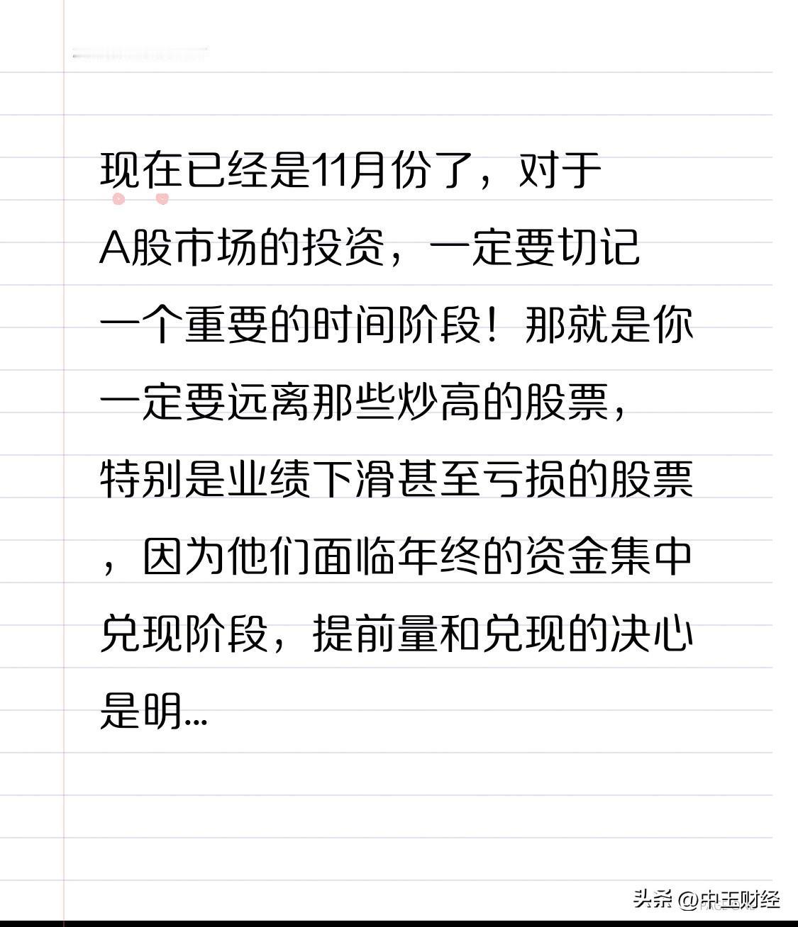 【A股】现在已经是11月份了,对于A股市场的投资,一定要切记一个重要的时间阶段! 那就是你一定要远离那些炒高的股票,特别是业绩下滑甚至亏损的股票,因为他们面临年终的资金集中兑现阶段,提前量和兑现的决心是明显的!这些股票减持的决心已下跌幅度还是非常猛的,不可小视!A股指数 A股股市分析 股票价值分析 A股行情