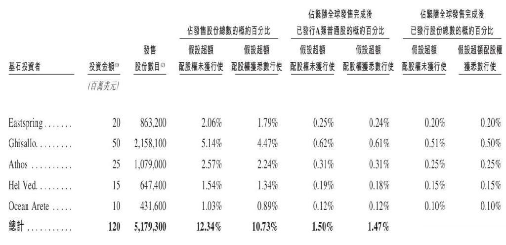 其中,Eastspring认购2000万美元,Ghisallo认购5000万美元,Athos认购2500万美元,HelVed认购1500万美元,OceanArete认购1000万美元,基石投资者认购的金额占总发行的比例约为12.34%。