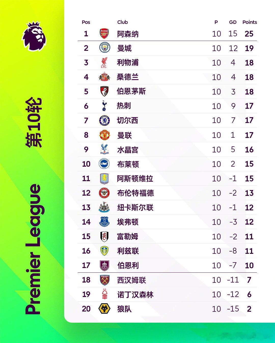 2025/26赛季英超第10轮10场战罢:◉ 桑德兰战平埃弗顿,排名第4英超联赛