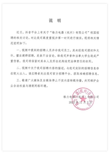 11月3日晚间,格力电器(杭州)有限公司发布严正声明称,视频中提到的招聘人员并非该公司员工,其未经公司授权和允许,擅自建群招聘,发表不当言论,给公司声誉和当事大学生造成严重伤害,公司将保留对其本人及所在机构追究法律责任的权利。