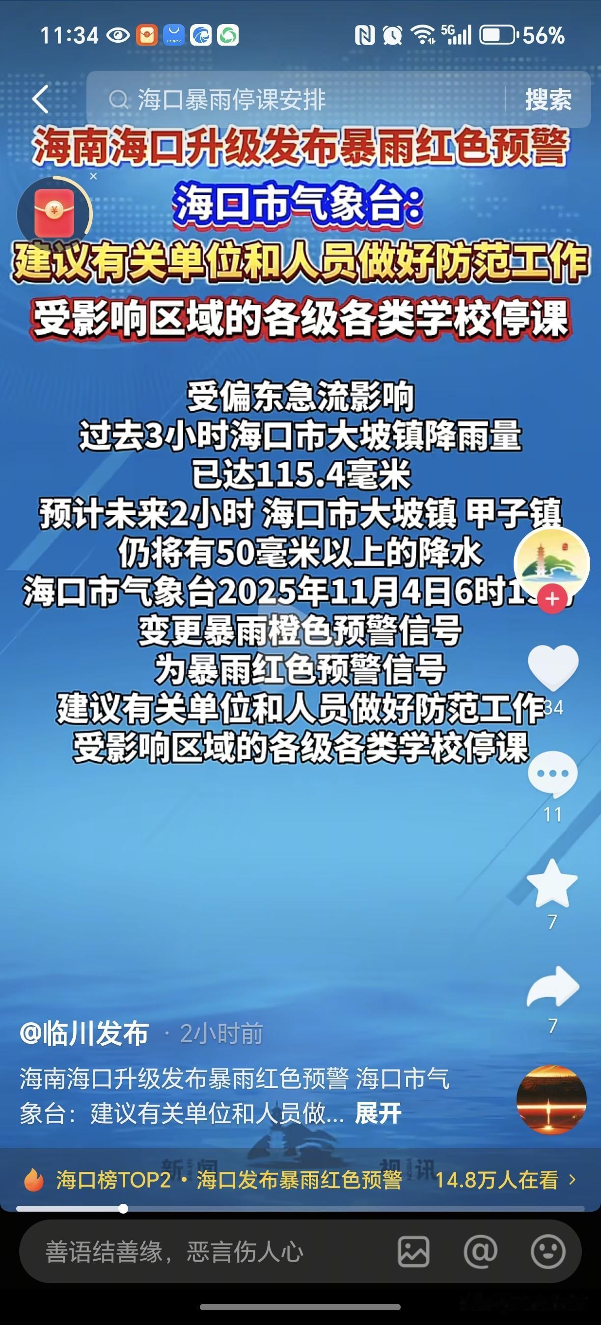 今天(11月4日)琼海、定安、屯昌、琼中等市县的学生们放假一天。当地及时应对,发布了停课通知。6、7号出岛列车也全部停运了, 这段时间感觉海南的雨水特别多,几乎都没怎么停过,连续的降雨,暴雨导致一些地方受灾,房屋漏水,田地淹水,本地菜农的青菜都有点供应不上了。这雨水影响蛮大的。 海南气象部门今早发布洪水蓝色预警+暴雨四级预警!大家出行一定要注意安全啊!