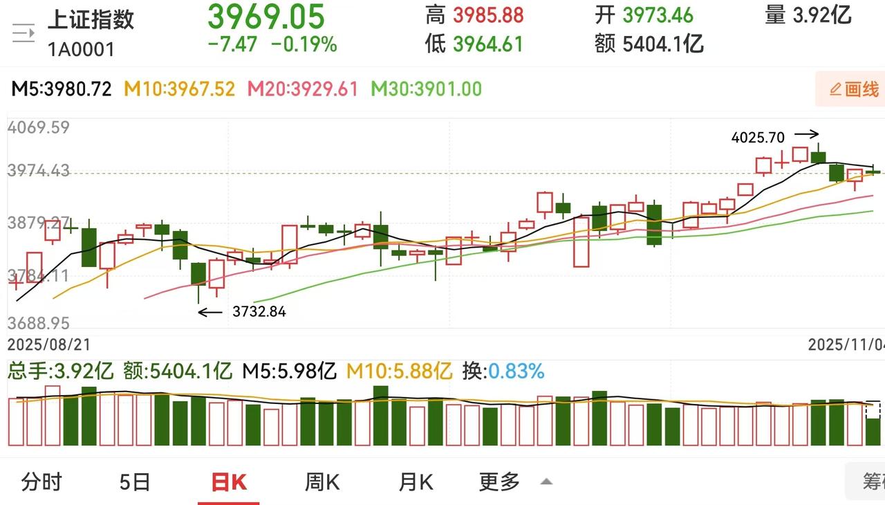 A股:2025年KPI已完成,接下来两个月只剩下了鸡肋行情   大盘冲上4000点,最高到达4025点,然后迎来了连续两天中阴,昨天小幅反弹后,今天继续要死不活、萎靡不振。 指数回落不多,但个股表现格外让人失望。高位科技股分化,要么持续性调整,要么高位震荡,阴晴不定,让投资者很难把握。低位老登们偶尔灵光一现,但没有持续性。 4000点之后的行情很像一盘鱼,吃剩下了鱼尾,不吃吧还有一点肉,吃吧不够塞牙缝,真的是弃之可惜,食之无味! 何以至此?皆因主力已经完成了年度KPI:每年10%-20%的沪指涨幅。 10%是底线,20%是天花板,而大盘今年的涨幅到目前已经来到了18.5%,剩下的不到2%妥妥的一点鱼尾,鸡肋行情。今年完成4000点目标,2026年再涨10-20%,来到4400-4800点;2027年4900-5800点…,一年一个台阶,实现中国股市长达10年以上的慢牛。 A股正在美股化,正在往“人家股市”走去,这不正是我们盼望已久的样子吗?只是这种行情极其考验每一个投资者的耐心,尤其是散户投资者。过往那种疯牛、暴涨行情已成历史,唯有耐心等待方能守来收获。 所以,面对今年剩下的没有KPI两个月,我们只能尽量减少操作,尤其是高位股,逢反弹减仓可能是唯一策略。而低位股唯有持有,逢回调多时补仓降低成本。 总结一下:今年行情已经结束,多看少动保住收益明年再战! 股市分析 A股指数 股市第一线
