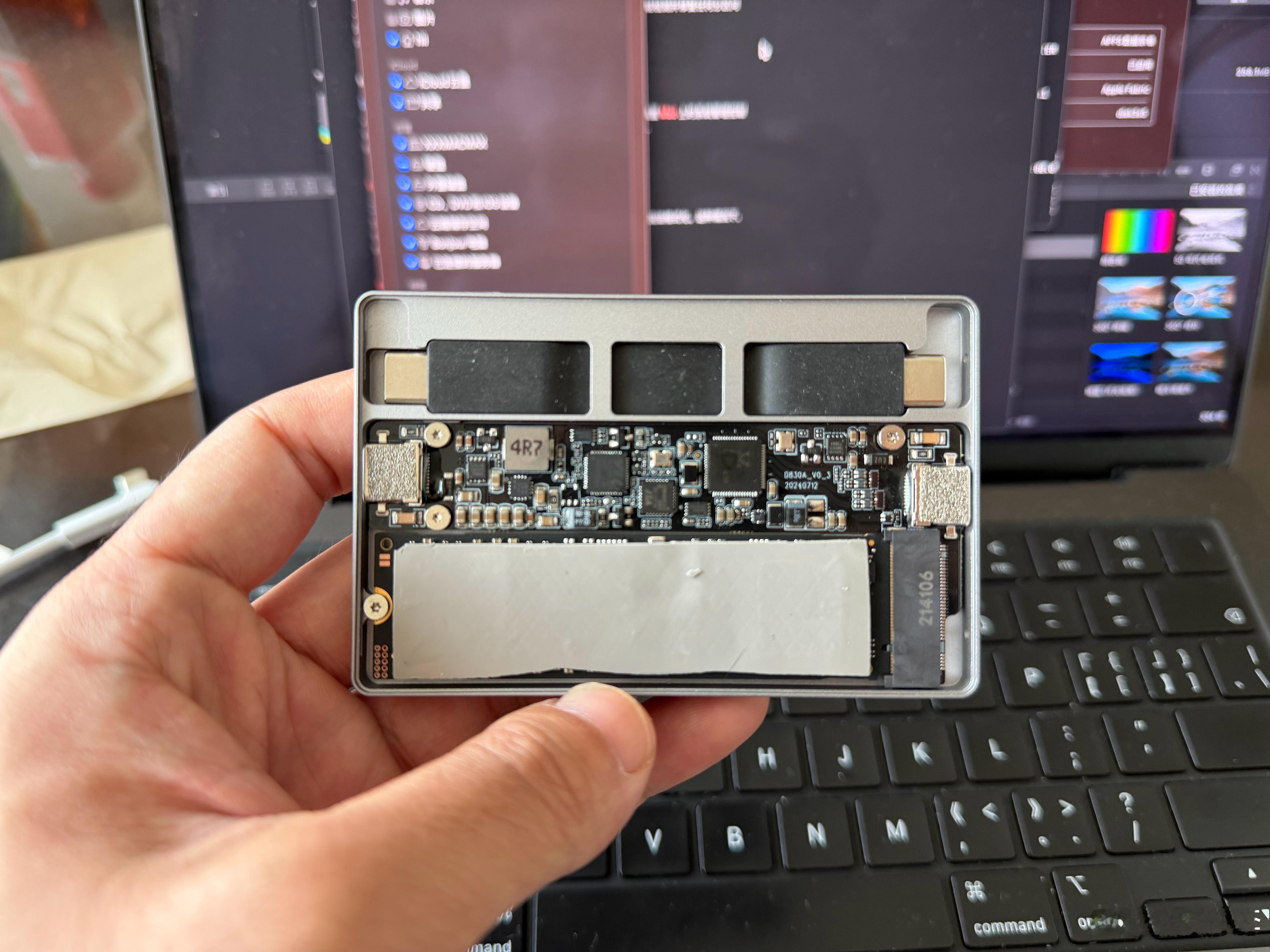 闪极 PLUS固态硬盘盒,我给它插了一条三星 990 Pro 2TB 的 M.2 硬盘条,这种硬盘一般是在台式机做系统盘的,通过硬盘盒形式可以自己 DIY 移动硬盘,硬盘条从网上按需选大小,丰俭由人,读写超快