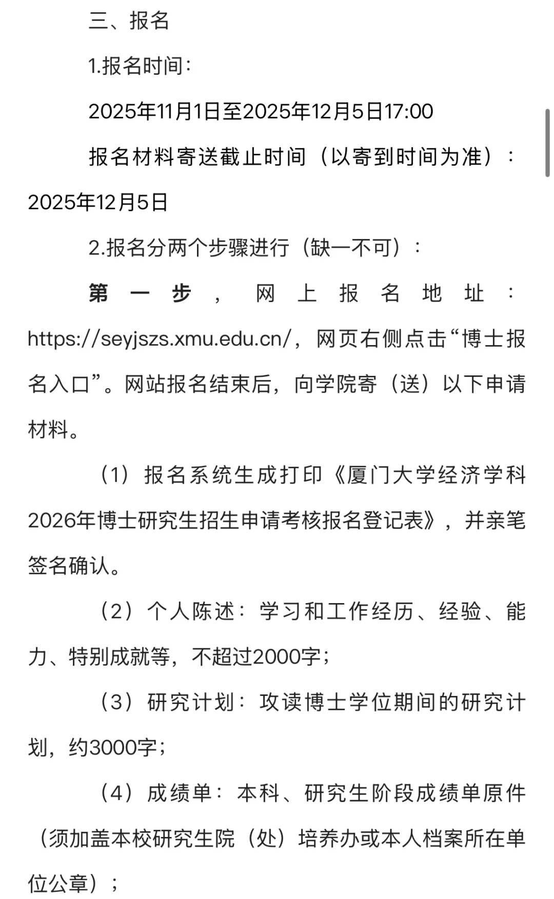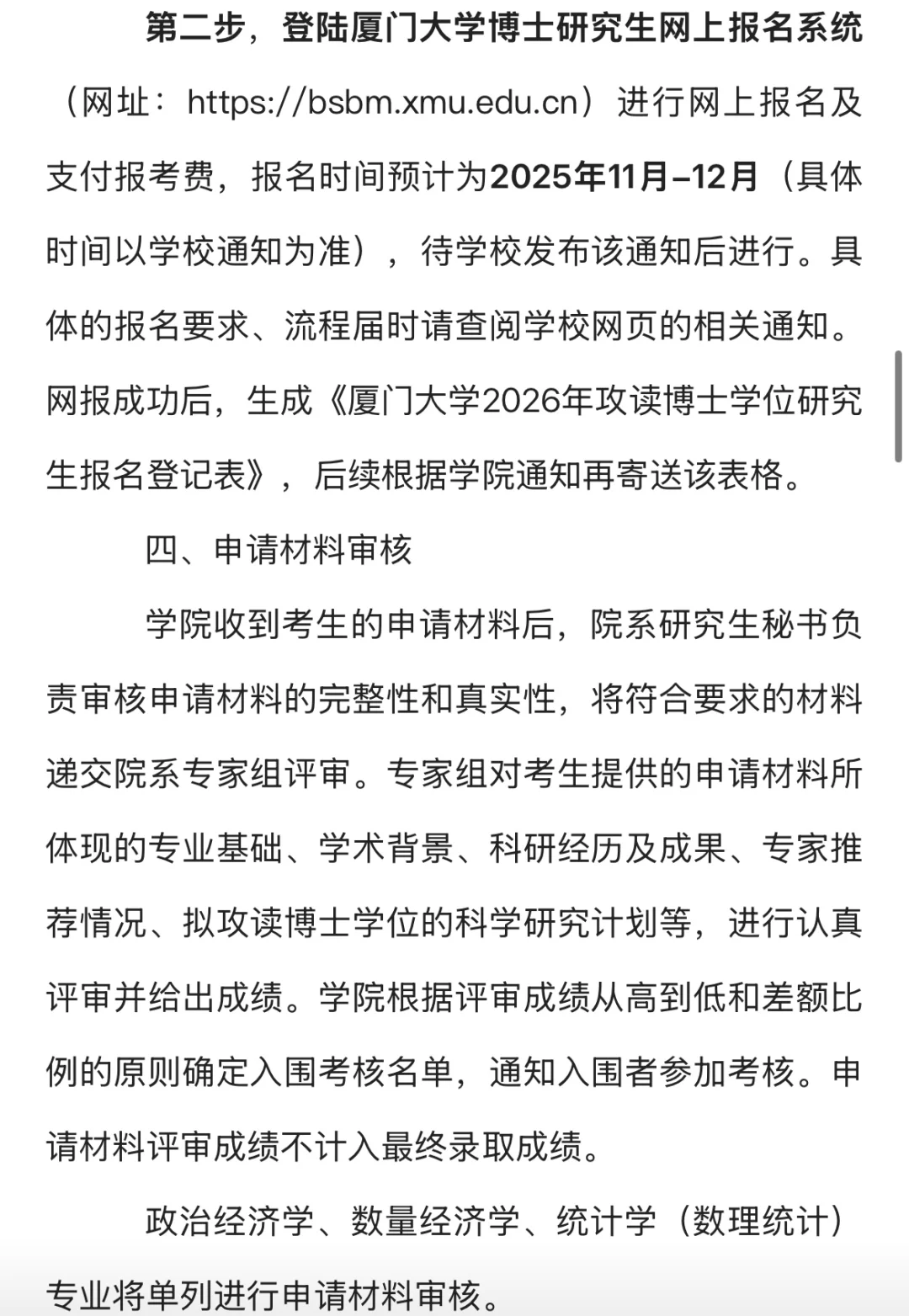 厦门大学经济学科2026年博士生招生采用申请考核、硕博连读和本科直博三种招生方式。申请考核、硕博连读原则上一年分两批选拔,第一批次报名时间为2025年6月-7月,第二批次报名时间为2025年11月-12月。