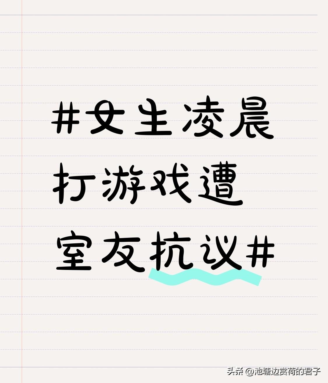 女生凌晨打游戏遭室友抗议 女生凌晨打游戏遭室友抗议这事,真太常见了。之前就有女大学生凌晨一点五十在宿舍挥舞塑料狼牙棒,灯开得贼亮,还把室友床上东西敲得叮当响。宿舍隔音差,谁能受得了啊,1.5万网友都吐槽她没素质。 还有大学生在宿舍直播,不分昼夜,严重扰乱寝室氛围。有人抱怨室友凌晨一点还在直播打游戏连麦,提醒还被骂。大学宿舍大家习惯不同,小摩擦不少,但凌晨还制造噪音,真的很没分寸。多为他人想想,别让自己的快乐建立在别人的痛苦上。
