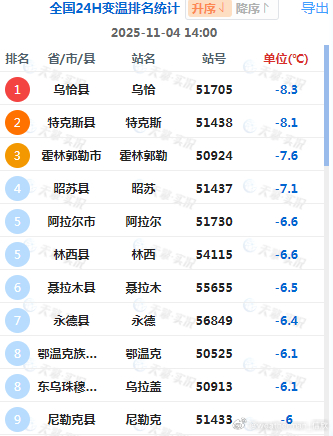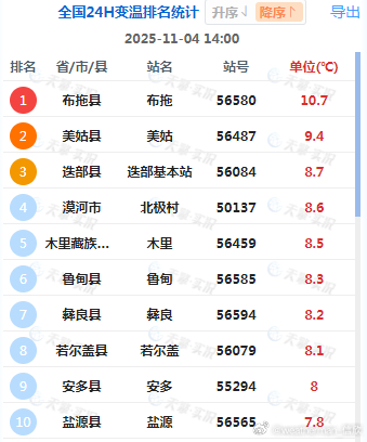 【气温】今天东北和西南等地降水结束,光照增多,使得气温回升,四川布拖升10.7℃、美姑升9.4℃、甘肃迭部升8.7℃,排名14时全国升温前3。今天新疆西部已经开始受到冷空气锋面云系影响,光照减少气温下降。新疆乌恰降8.3℃、特克斯降8.1℃排在14时全国降温榜前两名。