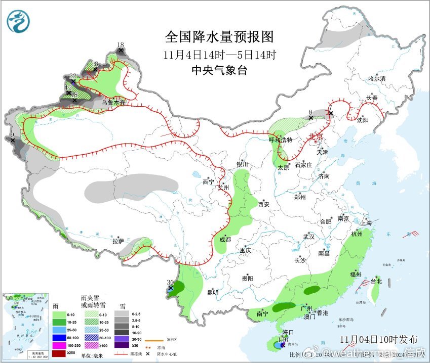 【降水】今天08-14时,降水主要在华南和江南,西南地区的降水减少。海南站点包揽了6小时降水榜前7,定安76.6毫米排名榜首。从雷达动画看,降水总体在东移。今天下午到明天中午,华南和江南的降雨自西向东逐渐结束。但新疆西北部因为冷空气影响,雨雪会明显发展增强,部分高海拔站点可能出现强降雪。
