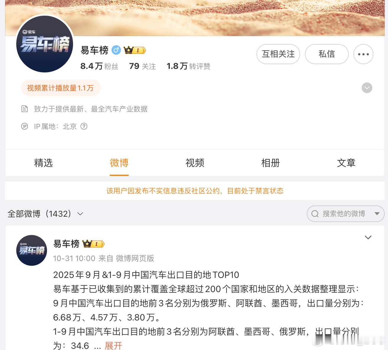 易车榜因为发布「不实信息」被禁言。难道真是周榜惹的祸么?[捂嘴哭]