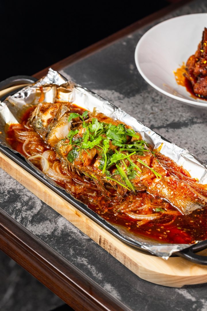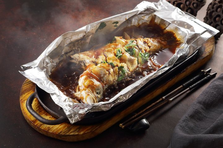 采用新鲜活鲈鱼现杀现切,保证了最后上桌的那一口“鲜”,肉质也更加细腻。用姜蒜香去掉鱼腥,带出鱼本身的鲜。葱蒜的香味,不像洋葱那么呛,香味及辛辣度都比较含蓄。烤熟的鲈鱼,外焦里嫩,香气扑鼻,肉质鲜嫩又少刺,老少皆宜。当包裹的锡箔纸打开的一瞬间,浓浓的鱼香霸占了整个嗅觉。夹起一筷子鱼肉,入味的酱料浸入鱼肉的肌理中,使得每一块鱼肉口感层次丰富而鲜明。鲜嫩爽滑的鱼肉滑进嘴里,十分Q弹。