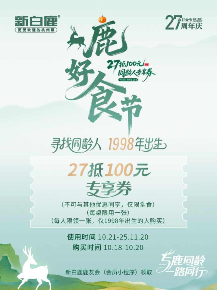 在新白鹿27周年庆活动期间,为1998年出生、同样27岁的“同龄人”,赴一场特别的“同龄之约”:1998年出生的27岁的朋友,登录“鹿友会”,即可领取“27元抵100元周年折扣券”,用专属优惠回味青春味道,开启新岁惊喜!