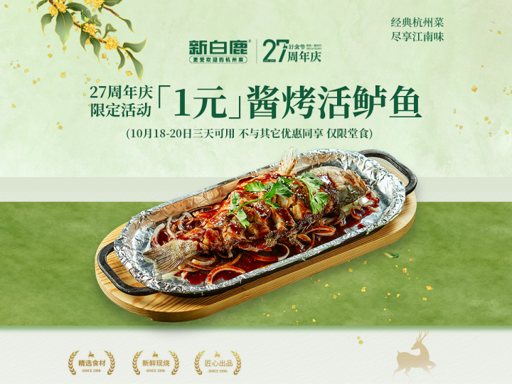 “1元酱烤活鲈鱼”是新白鹿27周年庆的主打活动之一。