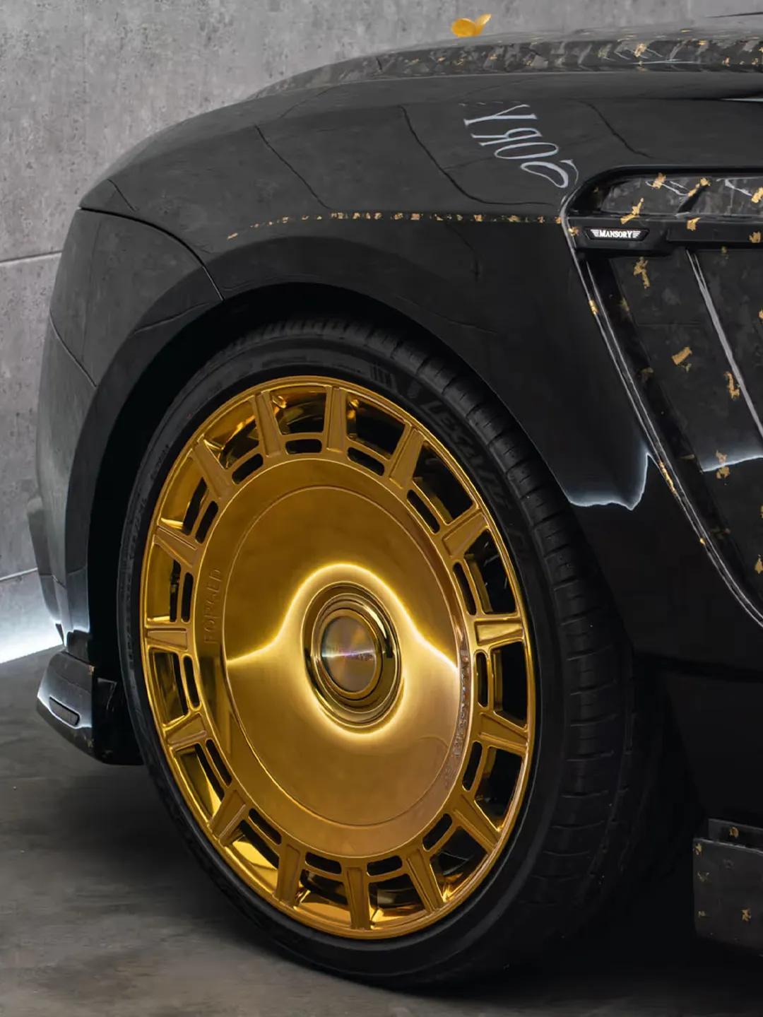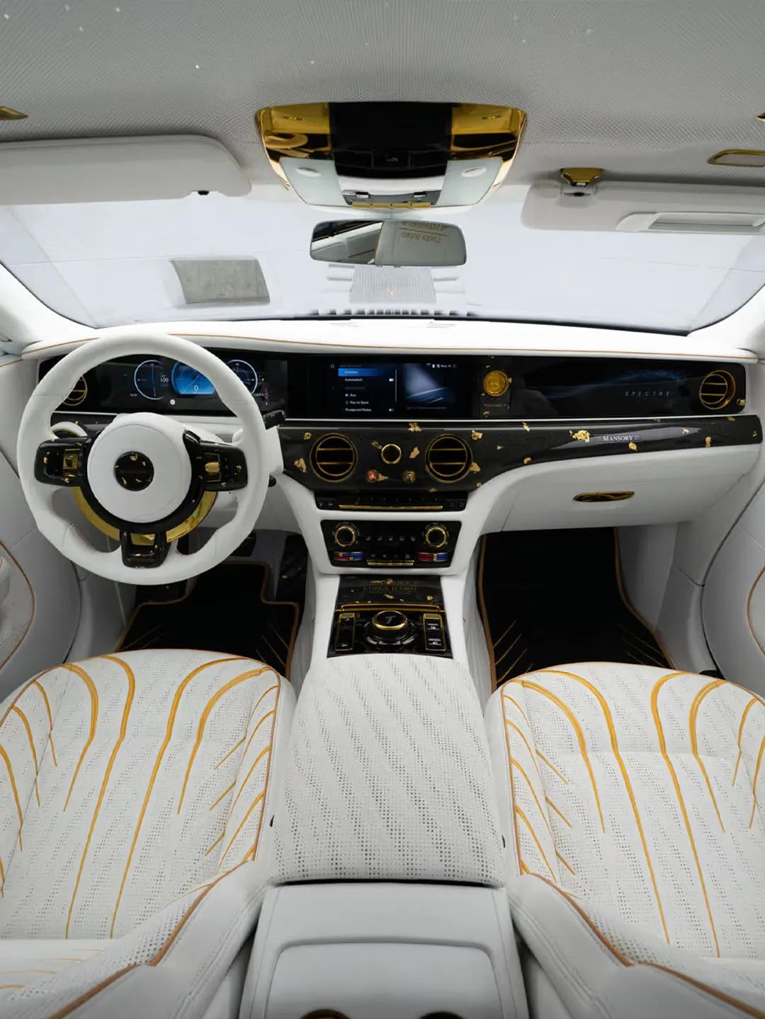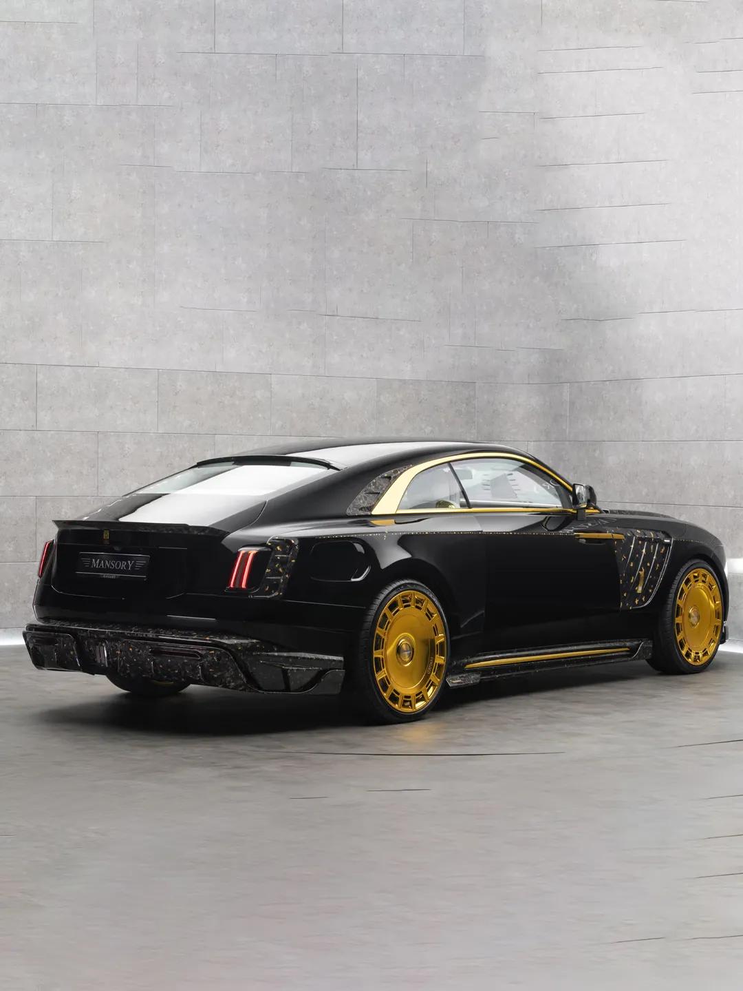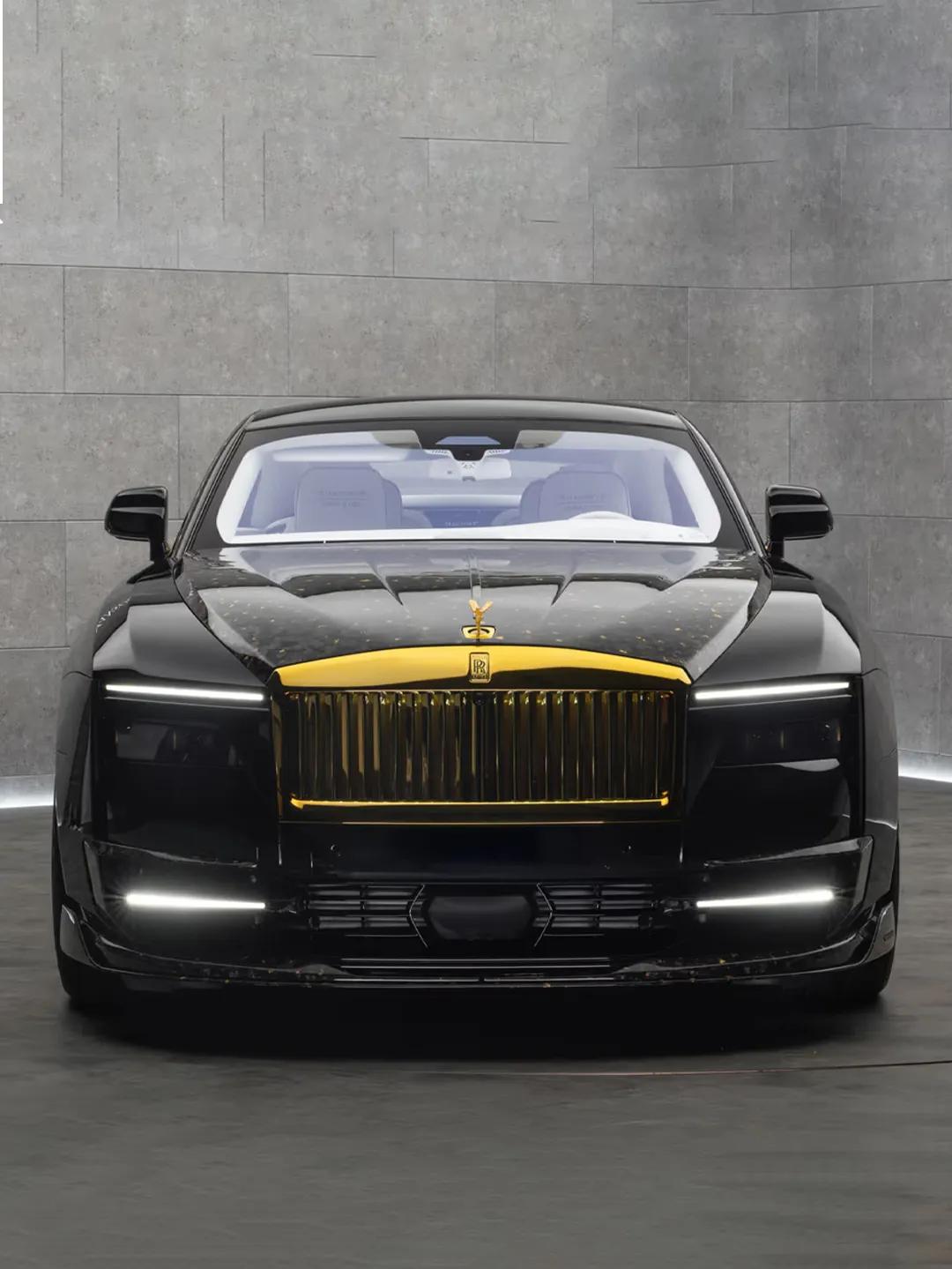 最近,德国改装厂Mansory在意大利都灵发布“2026 Mansory Equista Linea d’Oro”——基于劳斯莱斯Spectre的纯电双门轿跑。全车覆T200碳纤维,金线描边,宽体+23/24吋锻造轮,气动悬架降低20毫米。保留原厂430千瓦、900牛米双电机,0-100公里/小时4.5秒,续航530公里。内饰真皮刺绣、星空顶、40色安全带,可选V8/V12模拟声浪。全球限1辆,起价约人民币1380万元,按客户规格完全定制。