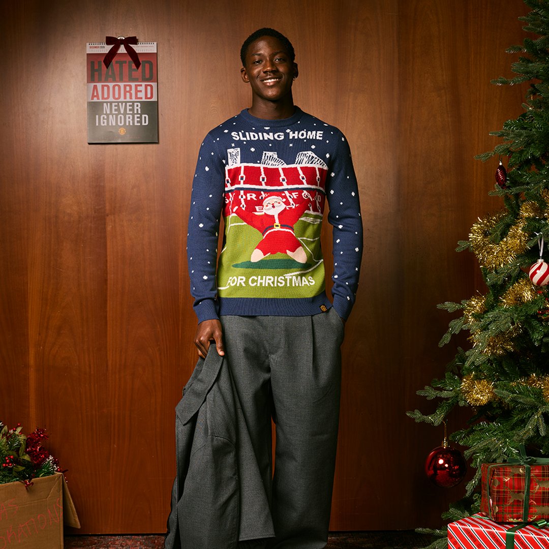 梅努上身了俱乐部商店上新的圣诞毛衣;B费则身着本赛季曼联主场球衣入镜。
