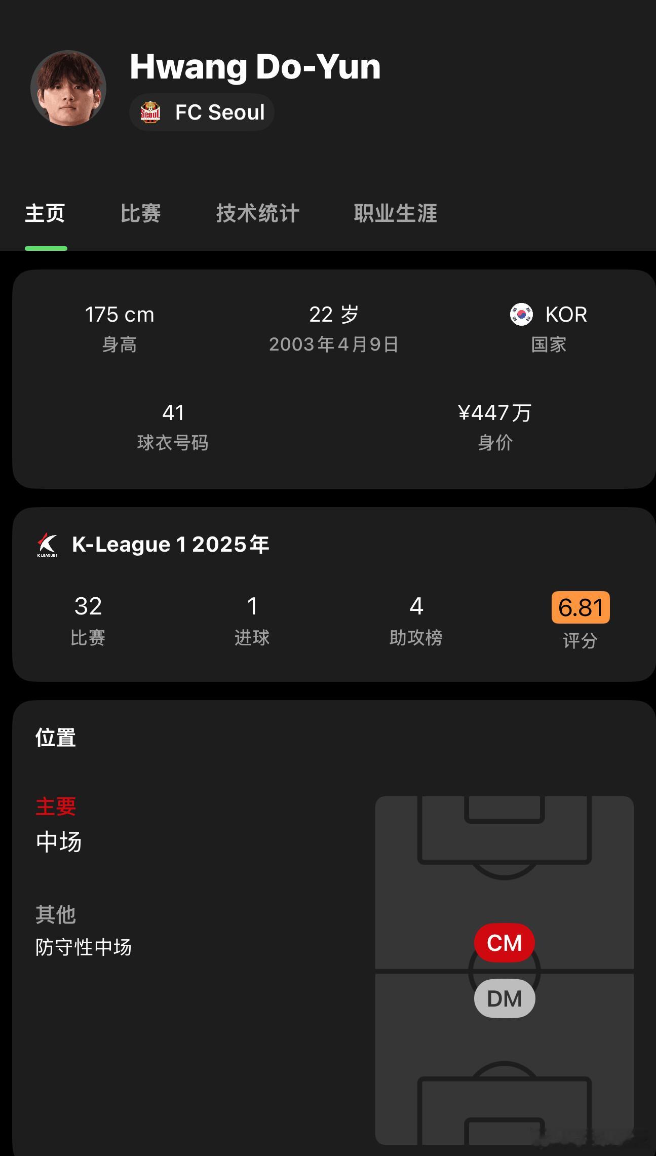 首尔41号年轻的中场黄度允上一场给我留下了一定印象,已入选了韩国U22国家队的集训名单,将会来到中国踢熊猫杯。