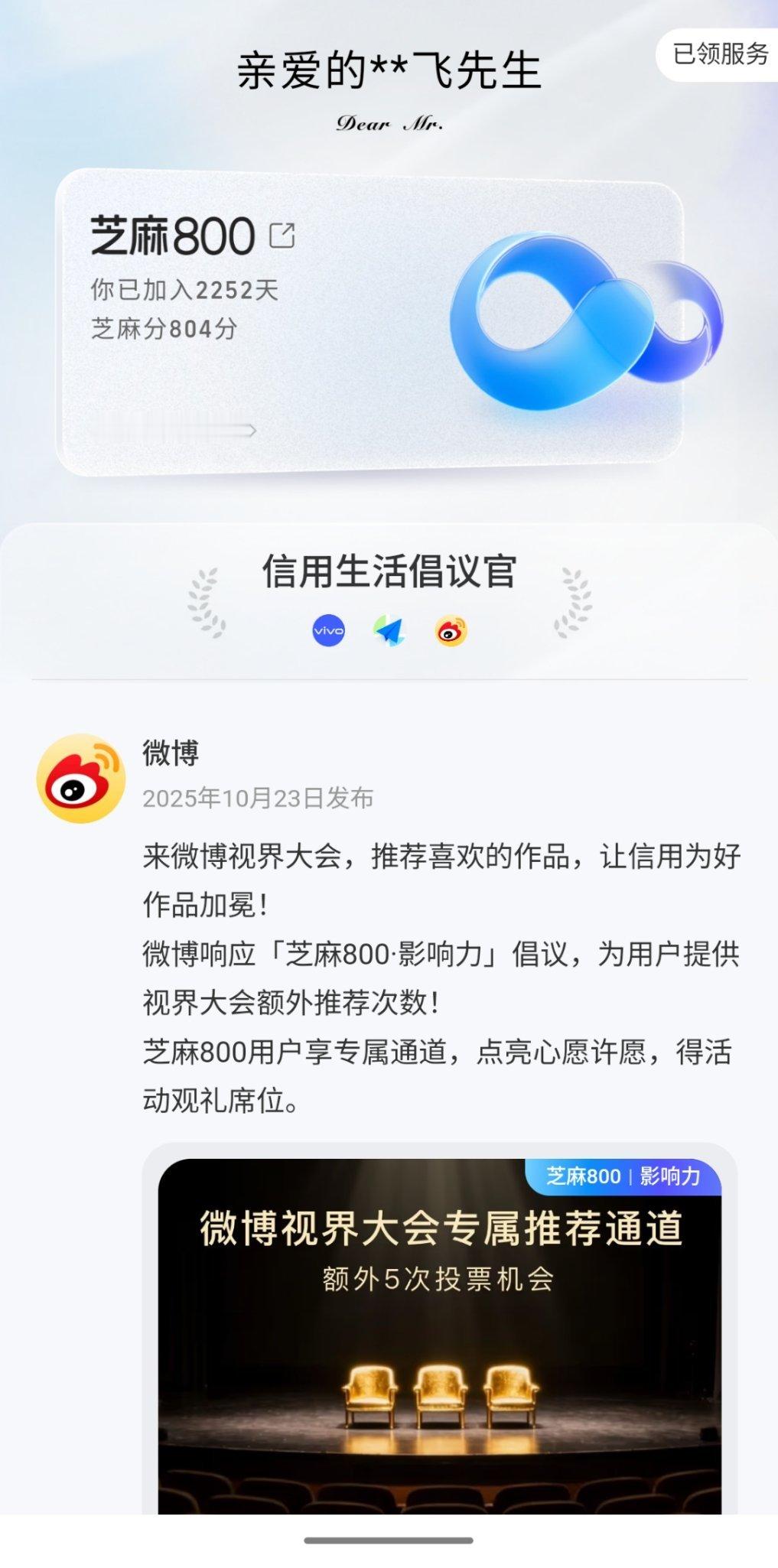 最近芝麻 800 加盟微博视界大会,还打出 “好信用为好作品加冕” 的 slogan,赶紧看看我的芝麻信用分-804分!