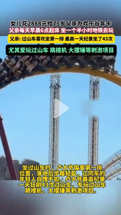75岁大爷一天刷过山车43次,简直太疯狂了! 别人的75岁,是遛鸟喝茶岁月静好,而这位北京的卢大爷的75岁,则是和过山车“上山”“下地”43次! 实在是太疯狂了——一大早刚睁开眼,他就直奔游乐园的刺激项目,过山车第一排是他的专属宝座,连刷43趟,下来还声不抖腿不颤! 女儿给他办的年卡,他四年刷了8000次过山车,只要是刺激的项目,跳楼机、大摆锤全不放过,简直比打卡上班还勤快!工作人员都得喊他一声“卢哥”。 他自己还打趣说:“坐完浑身舒坦,胃病都好了!”叫那些下来之后路都走不稳的小年轻们都惊讶。 有人说年纪大了“心脏怎么可能受得住”,可卢大爷用行动证明:年龄只不过是自己增长的数字罢了。 谁说老了只能晒太阳,做事都得慢悠悠的?75岁,正是爱玩的年纪! 老年生活 社会百态 人到老年了,什么才是最大的幸福呢