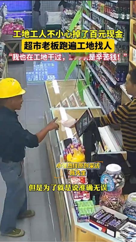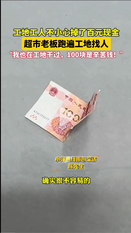 工人购物掉百元现金,这位老板做法非常暖心! 事情起因是,重庆一名建筑工人在逛一家超市时不慎掉落100块现金,超市老板发现后通过查看监控录像,跑遍了附近的工地,终于找到了这名建筑工人并返还了现金。 100块也许在今天并不是什么大钱,但是对于学生和建筑工人来说,可能就是好几天的饭钱或是一天的辛苦劳动。超市老板这一暖心之举,不仅仅个人优良品质的体现,更是对建筑工人的辛勤劳动的最大尊重! 社会百态 暖心瞬间