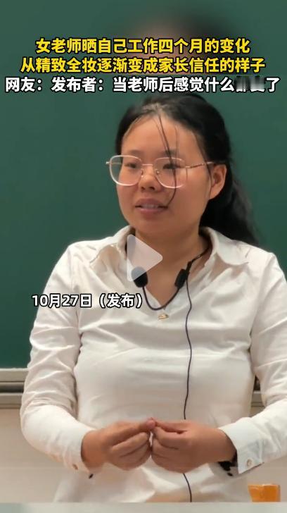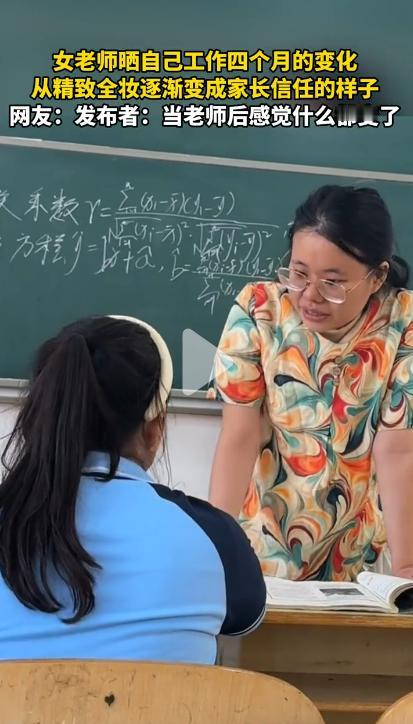 从精致女孩到”资深“人民老教师只要四个月?这个女孩变化太大! 在每个学生和家长的印象里,肯定有个腼腆安静的语文老师,开朗时尚的英语老师和口音浓重,邋里邋遢的数学老师。但事实是,当老师会平等的让每一个人变得憔悴! 四个月前,一名女子光荣的成为了人民教师。刚入职时,女子还会在上班前精心地打理发型,画上美美的妆,希望以”学姐“的身份成为孩子们学习上的引路人,可仅仅只过了四个月,她就成了一个头发一缕缕贴着脑门,带着厚重眼镜,憔悴神情的”老教师“,看上去简直自带10年教龄! 其实女子面貌变化的背后体现的是教育工作的辛苦,我们无论作为学生还是家长都需要配合老师的合理教学工作,为孩子的将来共同努力! 老师 职场 变化