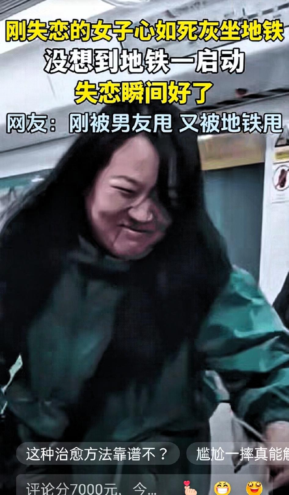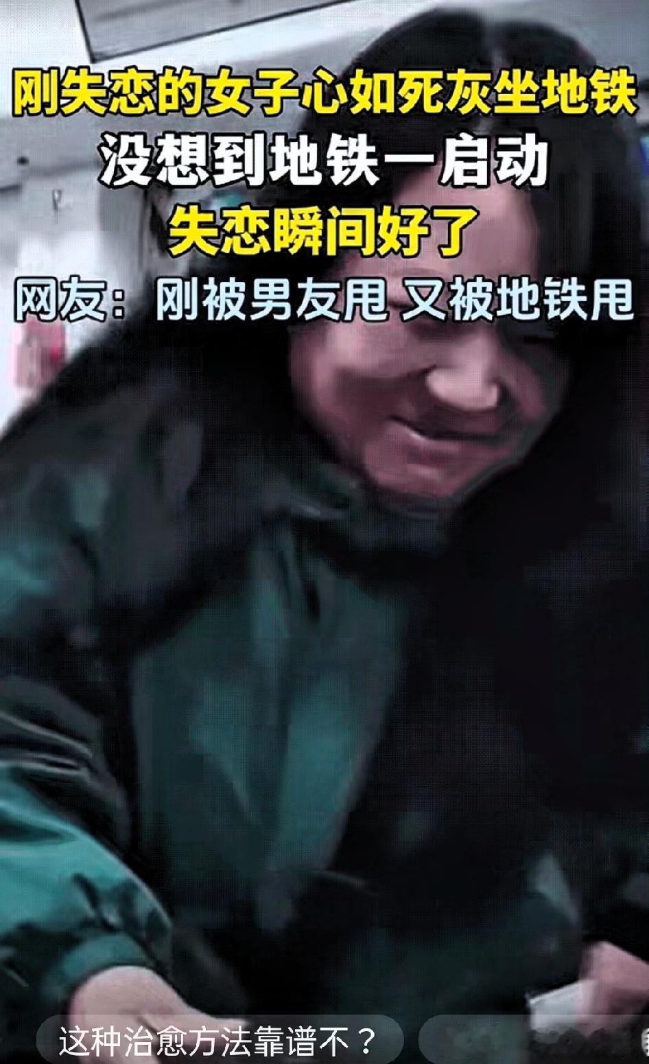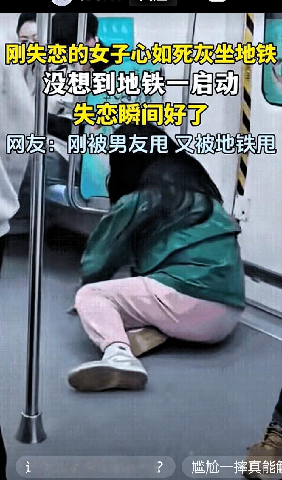笑不活了!”江苏一名女子刚 刚跟男朋友分手,姑娘坐地铁回家时那叫一个蔫儿。 脑袋耷拉着,双眼无神。朋友在旁边劝她:“站着累不累?找个座儿歇会儿呗”,她都没力气回应,就杵在那儿,估计心里还在翻来覆去想那些糟心事,眼泪在眼眶里打转。 结果地铁一启动,惯性一冲,她没抓稳扶手,“咚”的一声就结结实实地摔地上了!周围人都下意识“呀”了一声,她自己也懵了,趴在地上半天没起来,就在大家以为她要哭的时候,她突然“噗嗤”一声笑了——估计是摔得太突然、太狼狈,尴尬到极致,反而把心里那点委屈、难过全给笑没了。 网友评论区都乐疯了,有人说:“这姑娘今天是捅了‘甩人’窝?刚被对象甩,转头又被地铁‘甩’,双重暴击但怎么这么好笑!” 还有人调侃:“必须给地铁颁个‘最佳失恋治愈奖’,比喝鸡汤、找闺蜜吐槽管用多了,一摔解千愁!”真别说,摔完之后再看她,之前那死灰似的脸慢慢红了,眼神也亮了,嘴角还挂着没忍住的笑,哪还有半点失恋的颓样。 其实咱普通人都这样,失恋的时候总觉得天要塌了,躲在情绪里钻牛角尖,觉得这辈子都缓不过来。 可生活最有意思的地方就在这儿,它从不会让你一直难过,说不定一个猝不及防的小尴尬、小荒唐,就能把你从悲伤里拽出来。你看,那些以为熬不过去的坎,可能就因为摔一跤、听一句笑话,突然就释怀了。 失恋真没那么可怕,别跟自己较劲,也别揪着过去不放。说不定下一秒,生活就会用一个意想不到的“小意外”,让你笑着发现:原来难过这东西,也经不住一点小荒唐。 你们有没有过这种时刻?本来难过得要死,结果因为一件特搞笑的小事,瞬间就好了?评论区说说你的“神奇自愈瞬间”