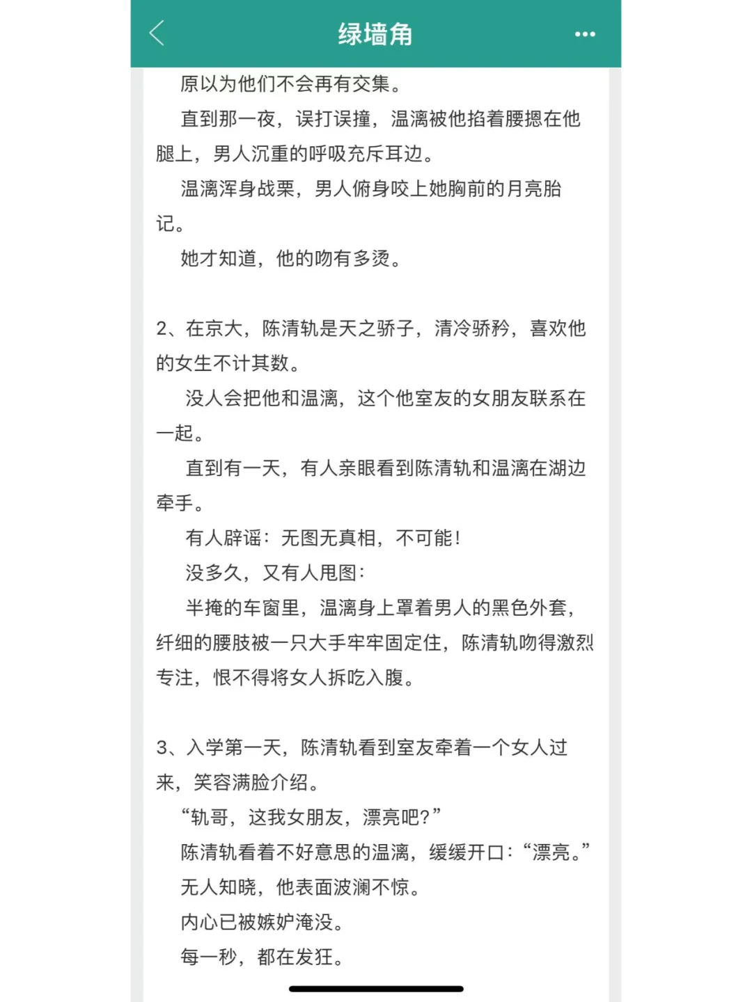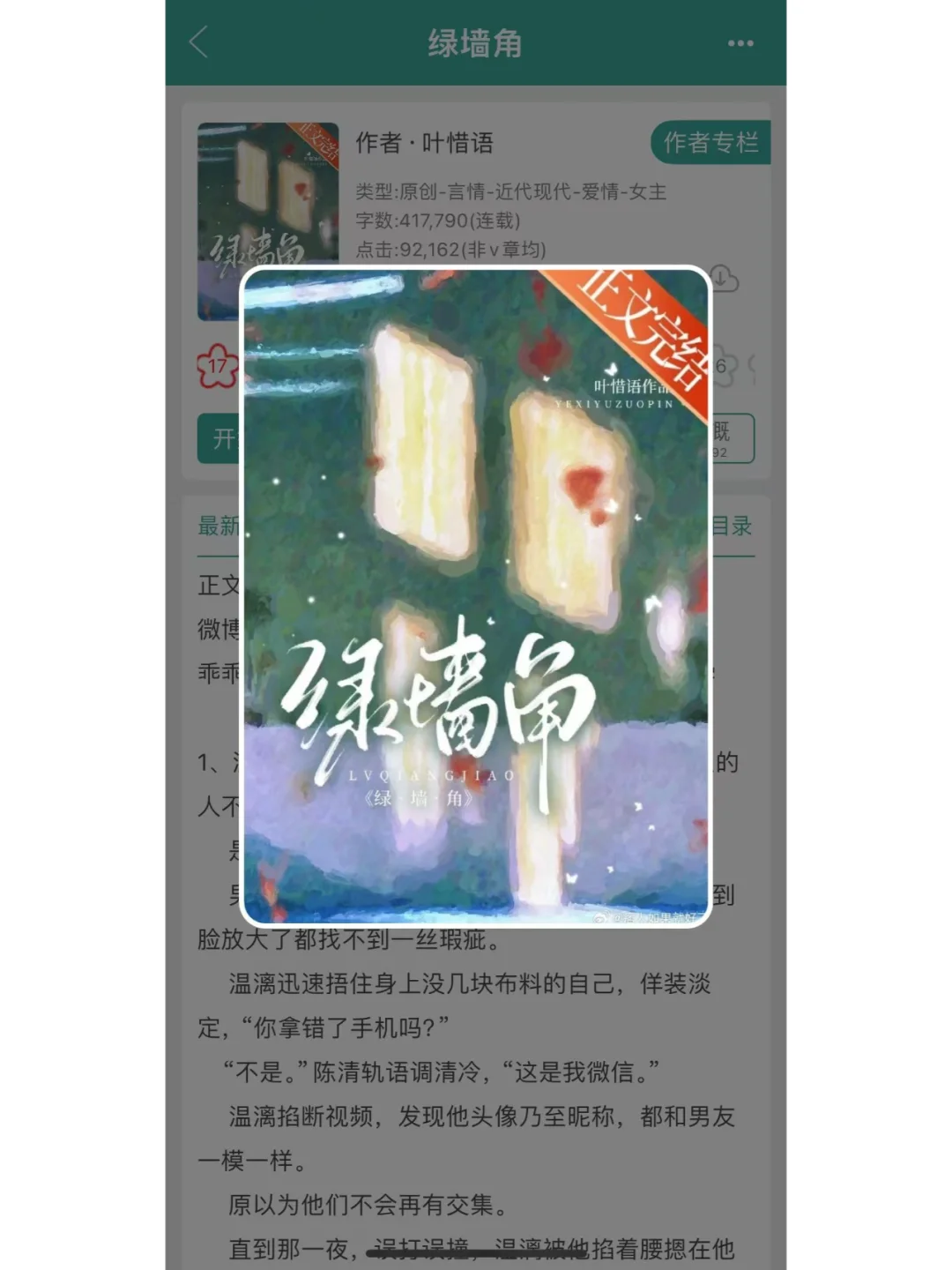 《绿墙角》,作者:叶惜语 主角:温漓,陈清轨 *乖乖女 x 冷痞 *温婉坚韧 x 清冷骄矜 *现言/成长/男暗恋/破镜重圆/挖墙脚刺激文学 小说 小说推文 暗恋 现言 成长 破镜重圆