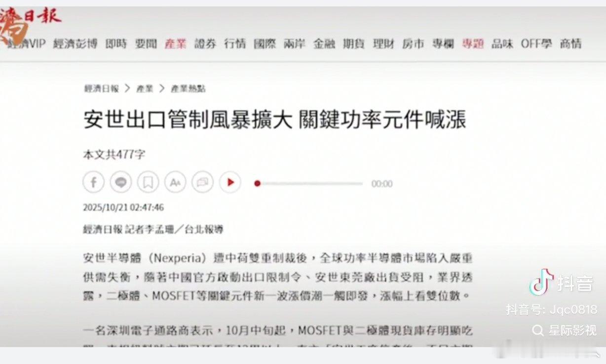 首先,大家可最近以看到最直观的破坏,就是中荷安世半导体博弈的关键节点被台企拆台。荷兰政府以“国家安全”为名强夺中资控股的安世半导体,冻结其资产与技术转移,中国随即祭出出口管制,本想以芯片断供倒逼欧洲汽车产业形成协同,通过让欧盟等付出实质代价去倒逼荷兰当局。