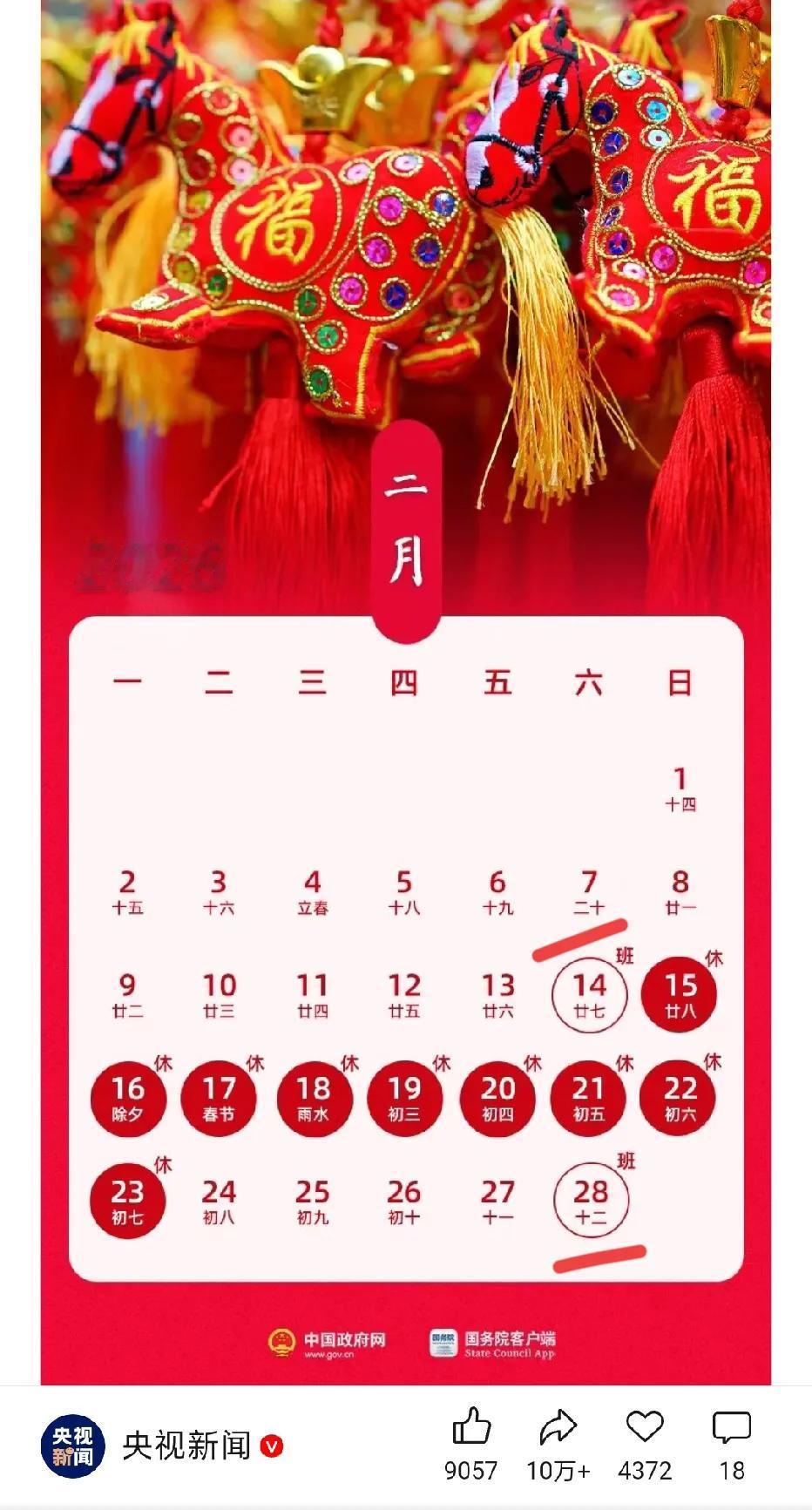 哇,终于看到了2026年的元旦和春节放假安排,元旦还是放3天!2026年1号至3号(周四至周六),周日补班,虽然补班1天,但放3天假期,很不错了!可以回家热闹了! 而春节,2026年竟然放9天假期!9天喔!哇,连着休息9天,开不开心?这是目前为止,“史上最长”的春节假期了吧? 记得2025年的春节,说多加了一天,共8天假期时候,就觉得太好了!没想到2026年还要再多加1天假期,一共9天假期!可以又在家多玩了!多团圆!多热闹!你们期待2026年的假期吗?