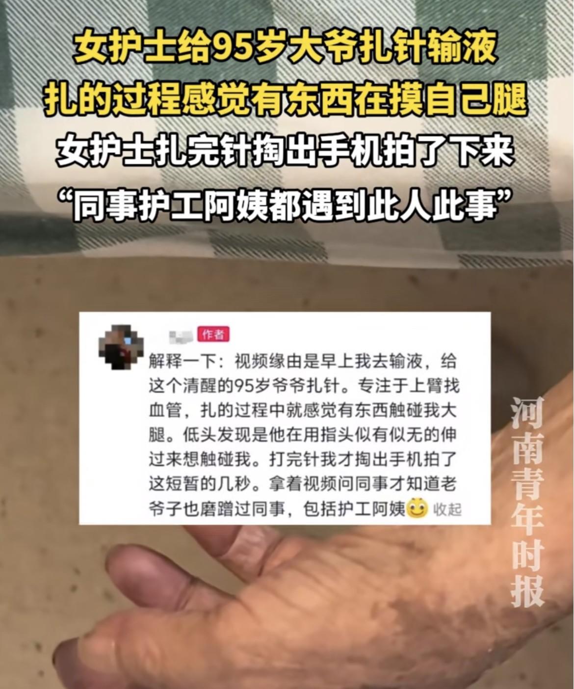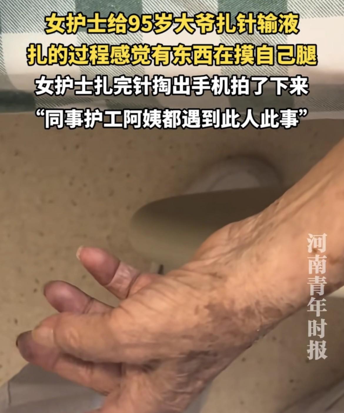 江西,95岁老人色胆包天,瘫在床上还不老实,趁着护士给自己打针的工夫,竟光明正大用手指磨蹭护士大腿,就连小护士打完针后还不停手。备受委屈的小护士跑回护士站向同事诉苦,才得知同事们都没能逃过老人的咸猪手,就连护工阿姨都未能幸免!这可真是坏人变老了! 据观象视频11月5日报道,江西,护士小丽在自己的社交媒体上传了一段视频。 视频中是一位95岁老人布满老年斑的手,从病床上垂下,老人动作迟缓,只有手指能轻微活动,不停磨蹭着身前小护士的裤子。 视频发上网后,不少网友表示疑惑,这老头是在干嘛?做手指康复训练? 也有网友直接指出,这老头虽老,但贼心不死,还想着揩油呢! 流氓可怕,老流氓更可怕! 视频发出后不久,小丽在评论区发出了整个事情的前因后果。 原来,小丽今年二十岁出头,是江西某家医院老年病房的护士,视频中的老人正是她负责的一位患者。 这位95岁的男患者如今瘫在床上,虽然神智清楚,但说话和翻身都很费劲,每次都需要护工协助。 这天交班后,小丽照常给老人打针挂水,可95岁老人的血管实在太难找,小丽只好蹲下身子,专心在老人的手臂上寻找可以下针的地方。 就这么专心找了十几分钟,总算大功告成,正当小丽准备起身的时候,才发现老人的手指紧紧贴着自己的大腿,还不停磨蹭着。 老人的这一举动让小丽心里一阵恶心,自己才二十多岁,连恋爱都没谈过,竟然让一个95岁的老头如此侮辱! 想到这里,小丽气愤地拿出手机,拍下了老人的龌龊举动。 更让小丽意想不到的是,当她向同事诉苦时,同事们竟然都纷纷表示,不稀奇,我们都被他摸过! 一旁的护工阿姨更是叫苦不迭,你们护士只有打针的时候才能接触,我们可是每两个小时都要替他翻身啊,这受的委屈可是大多了! 这天下班后,小丽是越想越生气,难道就因为老人年纪大了,又是患者,我们就只能吃哑巴亏吗?难道坏人变老了就能被原谅? 于是,小丽反手就把视频发到了社交媒体上,想让网友帮忙评评理。 视频发出后,还真引起了网友的热烈讨论,不少人在评论区支持小丽,替她鸣不平,声称一定要让老人得到教训。 也有人说,万一老人是无意识碰到的呢?且小丽也没有受到实质性的伤害,也不能因此就断定老人一定有错。 那么,应该如何从法律的角度来看待这件事呢? 性骚扰指以带性暗示的言语或动作针对被骚扰对象,强迫受害者配合,使对方感到不悦。 包括言语性骚扰、行为性骚扰和环境性骚扰,其严重程度也依次递增。 行为性骚扰通常包括非自愿触摸敏感部位、搂抱亲吻等,程度较重,可能涉及强制猥亵罪。 正如本次事件中的老人对小丽做出的行为,触摸了小丽的敏感部位,令其感到不适,符合行为性骚扰的定义。 任何违背意愿的性骚扰均属违法,需承担民事责任;情节严重,如造成精神障碍或多次实施可触犯刑法,按强制猥亵罪或寻衅滋事罪处罚。 根据《民法典》第一千零一十条规定,违背他人意愿,以肢体行为等方式对他人实施性骚扰的,受害人有权依法请求行为人承担民事责任。 老人在护士小丽为其打针时,用手指磨蹭小丽大腿,且在小丽打完针后还不停手,该行为明显违背小丽的意愿,属于以肢体行为实施的性骚扰行为。 本案的争议焦点在于,95岁的老人是否应当免除或者减轻处罚? 根据《治安管理处罚法》的规定,70周岁以上老人依法不执行行政拘留处罚,但仍可给予其他处罚,包括警告、罚款、限期出境等。 同时,还可以要求其监护人或家属加强管教,必要时可以建议社区进行重点关注。 有人说,他都95岁了,可能是无意识的行为呢? 在本案中,虽然老人95岁高龄且瘫痪在床,但根据报道其神智清楚,能够与他人正常交流,因此在没有相反证据的情况下,应当推定其具有相应的行为能力和责任能力。 而且,根据科室其他人的描述,老人的行为并非无意识为之,反倒是屡次不改,他因为瘫痪在床的不便,趁着护士为其近距离操作时,利用这一点实施了性骚扰。 小丽拍摄了老人实施性骚扰的全过程,具有较强证明力,可以直接证明性骚扰行为的存在。 若小丽想要维护自己的权益,可以向公安机关报案,要求对老人的违法行为进行行政处罚。 社会上对老年人犯罪往往存在宽容态度,认为人老了,算了吧,但是,法律面前人人平等,不能因为年龄而免除法律责任。 大家怎么看?