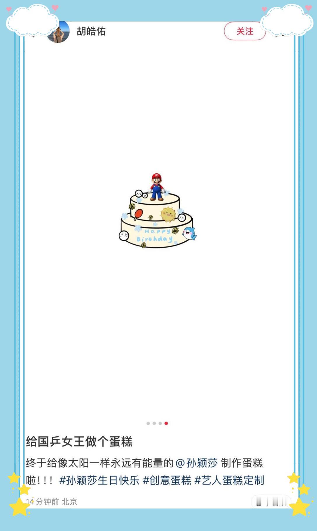 “莎看我”,视频中这句话很清楚,然后有一个影子低了下去。 蛋糕师发出手稿之后,就没有了。 莎莎的生日,不管是品牌方还是球迷粉丝, 都是开心快乐的, 海陆空的应援,从没有过的场面,都在莎莎身上出现了。 莎莎昨天在北京出发,去澳门之前, 发了一张和蛋糕的合影, 当然最最幸福的还是看到莎莎和爸爸妈妈的合照, 莎莎很少会把家人带到镜头前,这一次看到了莎莎得分享, 就知道莎莎和以前不一样了, 除了小白球,她也有在快乐的生活。 在爸妈面前,是最自然最放松的状态, 妈妈搂着莎莎的腰, 孩子是自己的,但是孩子也是国家的, 自己其实有更多的不舍和心疼。 蛋糕出来之后, 制作蛋糕的师傅,发出了手稿图。 这位师傅非常严谨,他用的词是“制作”而不是设计。 他是一位为明星设计制作蛋糕的知名蛋糕师,以往的作品,他都会记录, 他会写“设计制作” 而到了莎莎这里,他只是说制作,没有设计, 手稿也一起发了出来, 还原度很高。 看手稿,大家发现了很多的点, 白白圆圆的可以是乒乓球,也可以是小豆包, 上面的表情都是不一样的, 如果是蛋糕师傅设计,他是万万不敢做出瞪着大眼睛看人,一边嘴翘起的表情的, 这不是分分钟得罪客户吗, 会做一些可爱的表情。 所以,蛋糕大概不是蛋糕师设计的。 而这些表情,又和这些相似, 所以,蛋糕师在发出手稿后,没一会就没有了。 估计他一开始也是一头雾水吧。 晒出的烟花视频, 大家明显感觉莎莎一直是幸福的。 蓝色烟花,不是谁都可以买到的, 准备烟花的人也很用心。 莎莎一直在被呵护,知道这些就可以了。 莎莎在视频中配了“如我面对太阳,如你追希望”,sun&hope同时出现。 视频降噪有一句话特别清楚:“莎,看我” 在莎转身之后,有一个身影突然低了下去, 然后有光打在莎莎身上, 同行的人应该是在拍照。 只要她幸福就好了, 莎莎分享出来,相信也是想告诉大家她很开心,很幸福。 这样就好了!