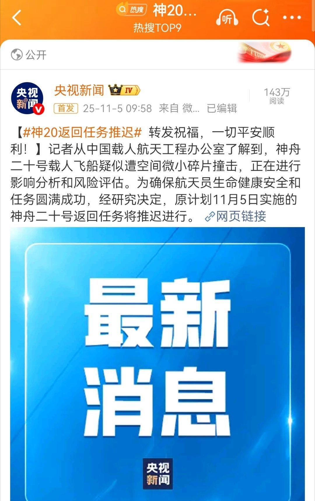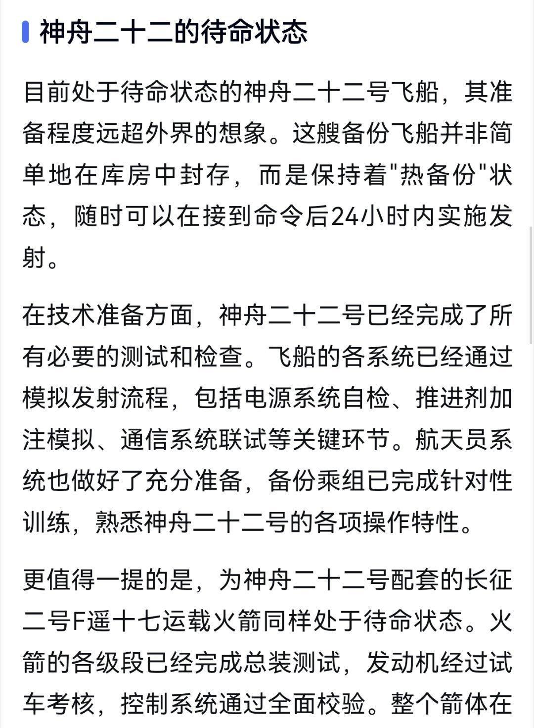 接下来全世界将看到中国是如何救援空间站宇航员的!俄罗斯、美国轮番表演了一番太空救援,俄罗斯联盟号飞船遭遇碎片撞击,救援飞船2个多月后才抵达,美国波音飞船抵达空间站后故障无法返回,救援飞船将近9个月后才将宇航员带回地球,被波音飞船带上去的那俩宇航员都瘦脱相了,看了着实有些可怕! 据央视新闻报道,神舟二十号载人飞船疑似遭遇空间微小碎片撞击,正在进行影响分析和风险评估,为确保航天员生命健康安全和任务圆满成功,经过研究决定,原定11月5日实施的神舟二十号返回任务将推迟进行。 就目前公布的情况来看,还是疑似遭遇微小碎片撞击 损伤情况还在评估,具体要等到评估后才能确认 对接在天宫空间站的神舟飞船主要有轨道舱、推进舱和返回舱三个组成部分,其中轨道舱是是在轨生活与活动的设施,与空间站对接后这个部分其实用处就不大了,就一个对接窗口,但如果分离后要多天才能返回,或者轨道绕行多天后才能对接的话,这个轨道舱就很重要。 另一个是推进舱,这是燃料与动力所在的位置,还有返回舱,这是航天员返回地球是保命的关键舱室。撞击哪个位置影响最小呢?轨道舱应该是最小的,因为这个在空间站时只是对接的一个“通道”,如果立刻返回,这个轨道舱就没啥用。 剩下的两个每个都很重要,俄罗斯在2022年12月14日遭到碎片撞击的Soyuz MS-22就是推进舱,当时一颗微小的碎片撞击了太阳能电池碎片的根部,刚好这里是整艘飞船的冷却系统所在,结果在几分钟内冷却剂漏光了,飞船不工作时一点影响都没有,但一旦工作发热,电子设备无法散热,宇航员的轨道舱内温度就会失控。在太阳的照射下,飞船内温度可能会飙升到40℃甚至50℃,宇航员中暑事小,热射病也可能发生。 所以这推进舱撞毁一个冷却设备问题都那么大,要是撞到燃料罐或者发动机,那问题就更大了,搞不好开机就爆炸,这个绝不是小问题,必须要认真对待,查到确实没有问题之后才能返航。哪怕是有万一,也不能拿航天员的生命开玩笑! 那么如果神舟二十号飞船损伤严重,无法返回,最快什么时候可以发射?答案是大约8~10天内即可发射: “中国载人航天实行“发一备一”安全机制,神舟二十二号飞船已在发射场待命,具备快速发射能力,可作应急救援使用。” 中国载人航天工程办公室曾在神舟十三号、十四号任务前说明:“按照‘一发一备’模式,备用飞船在轨道舱和返回舱完成总装测试后,随时可以在约一周内完成应急发射准备。” 中国载人航天工程办公室曾在神舟十三号、十四号任务前说明:“按照‘一发一备’模式,备用飞船在轨道舱和返回舱完成总装测试后,随时可以在约一周内完成应急发射准备。” 就过去的情况来看,大约在7-10天左右,当然如果神舟二十号检修完毕没有问题的话,那应该在几天后就可以恢复返回计划了。 中国这“发一备一”安全机制可不是说着玩的,美国在2024年6月5日发射波音飞船,结果上天后发现各种泄露问题,最终连波音都不敢让宇航员坐这艘飞船返航了,又没有备用飞船,当时考虑了很多模式,请俄罗斯救援,请SPACEX救援,最终拖到2025年3月18日才返回地球,两名宇航员看起来像鬼一样,这快60岁的大爷大妈真经不起这样折腾。 所以接下来全世界都会看着中国如何操作!这么说呢,应该说是表演,看看全世界最强大的工业国家是如何救援太空中航天员的!