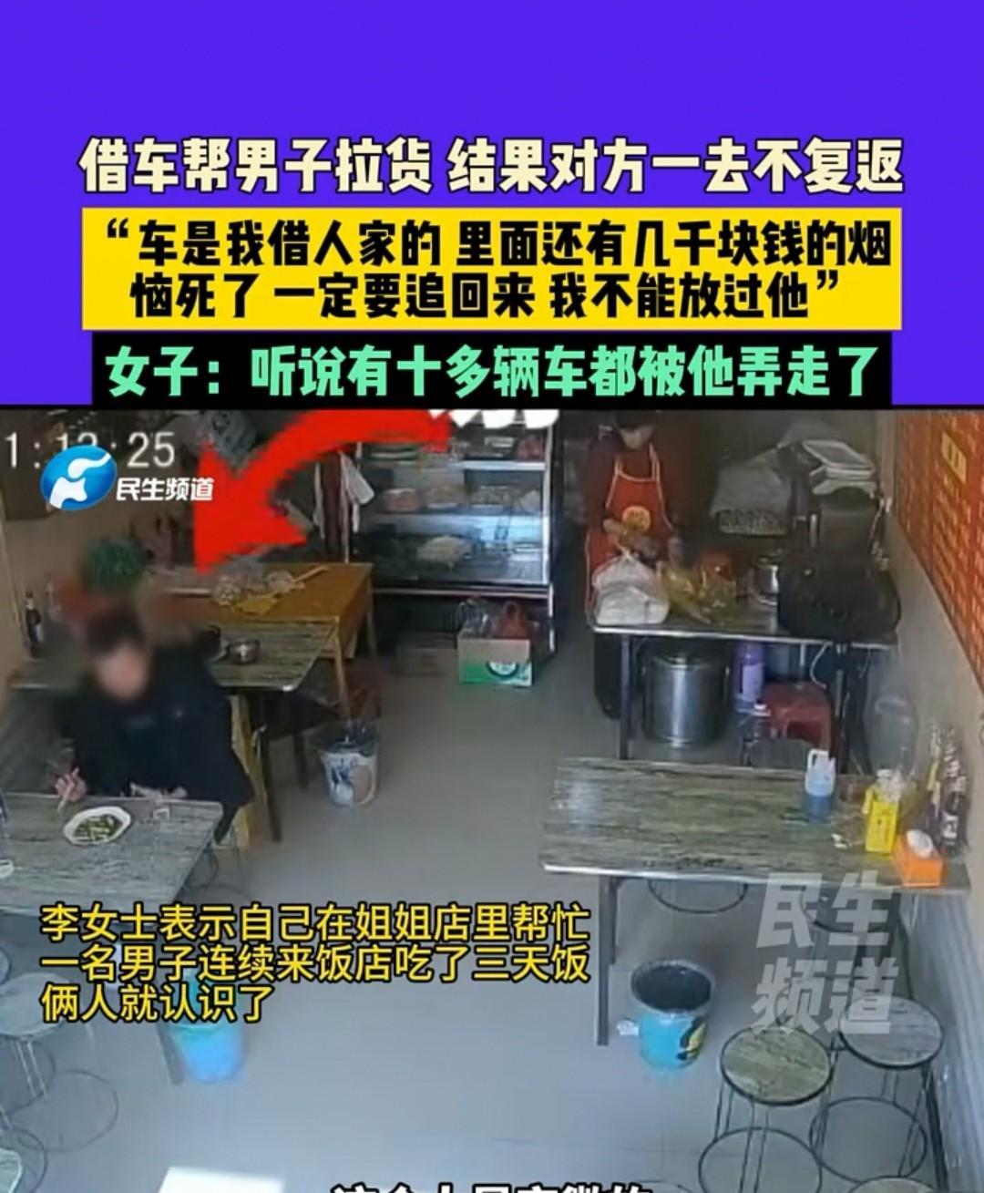 周口,一名陌生男子在餐厅吃了三天饭,之后想出200元,让老板娘帮忙找一辆车,好去拉货。后来老板娘的妹妹借了一辆车,陪同男子一起去,可到了目的地后,男子让妹妹在面馆等着,他开车去接几个人。可是左等右等,男子都没有回来,妹妹非常着急。老板见状,让她给男子打电话,这时妹妹才想到,自己根本没有对方的电话。她焦急难安,称:车子是她向别人借的,车上还有几千元的烟,现在找不到对方,该如何跟车主交差呀? 李女士是在姐姐的餐馆帮忙,这几天她就看到有一个陌生的男子,连续三天都来吃饭,这一来二去,大家就熟悉了,也开始摆起了龙门阵。 后来男子说自己想到河北去拉货,想让李女士的姐姐也就是老板娘帮忙找一辆车,他愿意出200元的车费,以示酬劳。 李女士的姐姐开着餐厅,有点忙,自己的是小车,不可能借给对方去拉货,所以就拒绝了。 李女士看到这名男子连续来了三天,也算是半个熟人,再加上对方还要给车费,她就好意帮忙借了一辆车,陪同男子一起前往。 在路上,双方聊得非常开心,到了目的地后,男子就让李女士在面馆等一下,他再去载几个人过来。 李女士也没多想,对方要车钥匙,她就大方地给了男子。 可接下来,李女士左等右等就是等不来男子,这时她才发慌了,从来没有想过男子会骗她,现在的情况让她有点措手不及,都急得快哭了。 老板见状,让她赶紧给男子通电话,看看是什么情况,不要出现意外。 这时李女士才想到自己根本就和男子没有联系方式,她也从来没有想过对方会骗自己,也从来没有想过对方会一去不复返。 后来她没有办法,赶紧报警。 最后才得知,这名男子以同样的方式已经骗走了十多辆车,并且骗的种类还不一样,连三轮车都骗走了。 李女士苦不堪言,声称这辆车是向别人借的呀,你这样做自己怎么向车主交代? 并且车主还表示,里面可有几千元的烟,对方把车开走了,相当于把烟拿走了,这笔损失得由李女士赔偿。 李女士一想到这里就后悔不已,就为了能挣200元车费,居然把自己都给套进去了。车如果找不到,不仅要赔偿烟,还得赔偿车,这前前后后不就是几万十几万的事情吗? 就算找到了,以后再向朋友借车,人家谁敢呀?这信誉完全就失去了,让自己以后在圈子里怎么混? 网友们认为李女士也太天真了,车不是你的,做事还那么大意,连对方叫什么姓什么、联系方式都没有,居然就直接把车钥匙给别人了。 做人,害人之心虽然不能有,但是防人之心不能没有啊,以后还是吃一堑长一智嘛,千万不要太马虎了。 再者,用别人的车去赚200元路费,合适吗?可能人家以为是你自己要用的,你现在倒好,拿着人家的车去盈利,不让你赔偿才怪。 一、陌生男子的行为已构成诈骗罪。 根据《刑法》第266条,其以非法占有为目的,通过建立虚假信任虚构拉货需求,骗取车辆及财物。 若车辆与香烟价值合计达3万元以上(依据两高诈骗案件司法解释),将被认定为“数额巨大”,面临3-10年有期徒刑并处罚金,同时需全额退赔损失。 二、李女士虽不构成犯罪,但存在重大过失。 依据《民法典》第1165条,其未经车主同意用借来的车盈利,且未核实对方身份、未留联系方式,需向车主承担全额民事赔偿责任,同时丧失个人信誉。 所以,李女士需要承担刑事责任与民事赔偿责任,需退赔车辆、香烟损失及其他相关费用。 三、借车需重点注意这几点: 1、借车给他人时,务必查验对方的身份证和驾驶证,拍照存档留存,明确其真实身份信息;对于陌生人或仅表面熟悉的人,坚决不要借车。 对于此事,大家又是如何看待? 素材来源于:小莉帮忙2025年11月5日