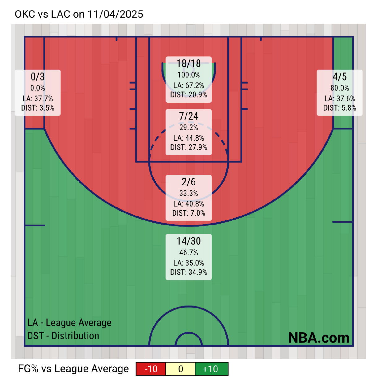 雷霆开季8连胜创造队史纪录,今天他们在限制区内18投全中…