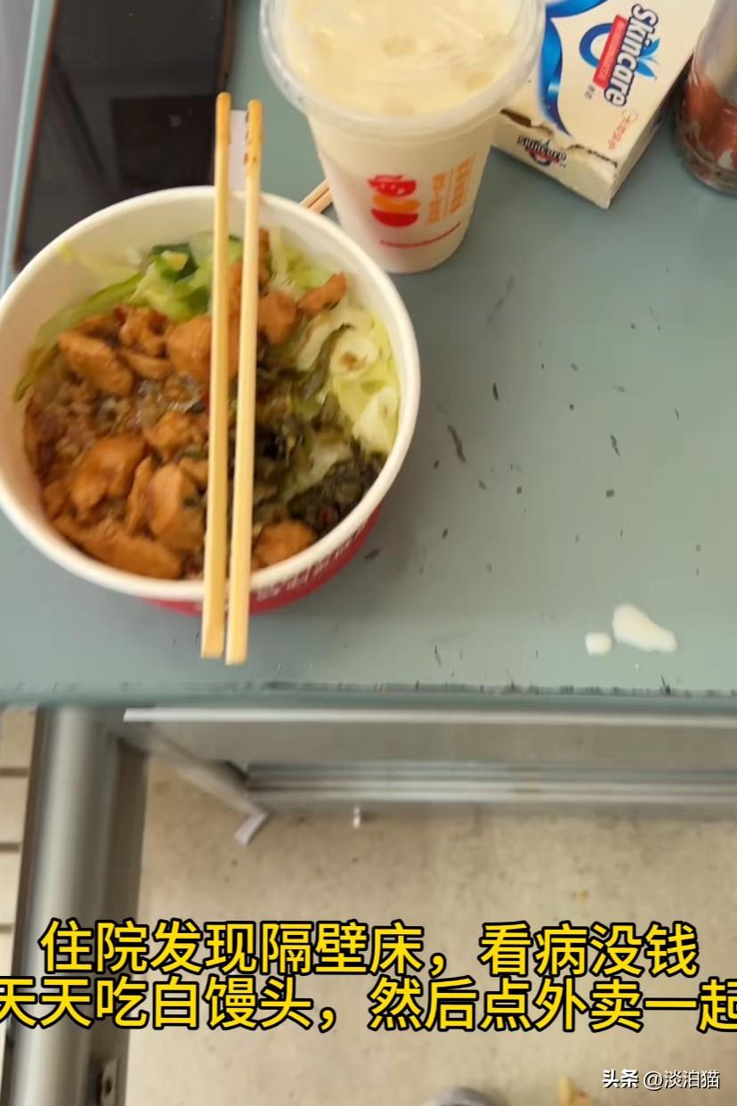 江苏苏州,七旬老人住院为节约钱连续两天啃馒头,邻床男子暖心投喂三天,出院时还帮老人把医药费结清,并开车送老人回家。 陈先生生病住院期间,他发现同病房有一位老人每次吃饭的时候都是吃馒头。第一天看到老人在饭点啃馒头时他没有在意,他以为老人是喜欢吃馒头。 到了第二天中午的时候,陈先生看到老人还是以馒头充饥。医生来查房时看到老人在吃馒头劝他:老人家,你要吃饭,吃点有营养的饭菜,不要总吃馒头。 老人听后有点尴尬,但他仍然真诚又坦白的解释自己家里没有什么钱,只能吃馒头填肚子。 陈先生听了老人的话,他心里一阵酸楚:人这一辈子图啥?老了生病住院还在啃馒头。陈先生点外卖时特意多点了一份给老人。 等外卖送到时,陈先生把外卖拿给老人,老人不愿意要。陈先生解释是店家做活动买一送一。老人才肯要。 就这样,陈先生连续三天为老人换着口味点外卖。老人不吃辣椒,陈先生会贴心的为老人把辣椒挑出来。老人对于陈先生给予的帮助,他很是感激。 老人也会和陈先生聊自己的事情。在聊天中得知,老人今年七十六岁,为了挣钱他在外面帮人洗车。这次住院是因为老人在洗车时不慎扭到腰。 因为没有钱看病,所以住院期间每天都是就着榨菜吃馒头充饥。得知老人的基本情况,陈先生心里不是滋味,他心疼老人在本应安享晚年的年纪却还在为生活奔波。 好在老人腰伤不是很严重,住院几天就可以出院回家。在老人出院这天,老人的老伴来接他。 陈先生得知老人出院,他帮着老人一起办理出院手续,还自掏腰包帮老人把医药费结清。末了,还开车把老人送回家。 看到陈先生对自己那么好,老人的心里很是感激,他和老伴一直说自己遇到了好人。陈先生也表示等到自己身体康复,会再去看望老人。