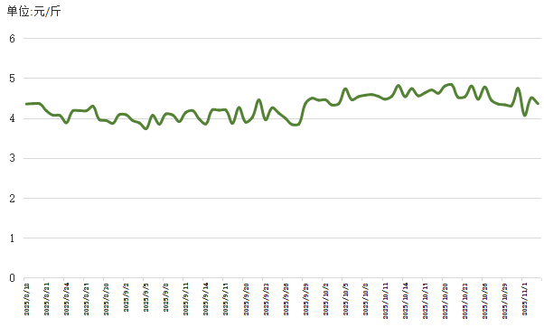全国香梨销地批发市场价格走势上,截至2025年11月3日,全国香梨销地批发价格指数报4.36元/斤,较前一期下跌0.09元/斤,跌幅1.91%。