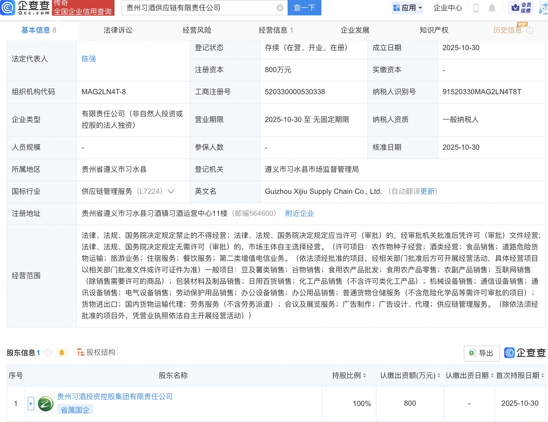 企查查APP显示,近日,贵州习酒供应链有限责任公司成立,法定代表人为陈强,经营范围含农作物种子经营、酒类经营、食品销售、豆及薯类销售、谷物销售等。企查查股权穿透显示,该公司由贵州习酒投资控股集团有限责任公司全资持股。