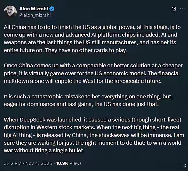 以色列学者阿隆·米兹拉希撰文称,在中国不断于全领域赶超的巨大压力下,美国正在正全力把整个国家的未来押注在人工智能AI上,“他们没有其他牌可打”。