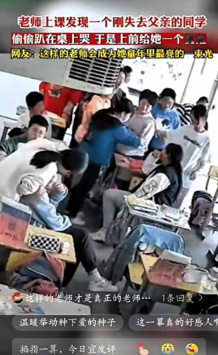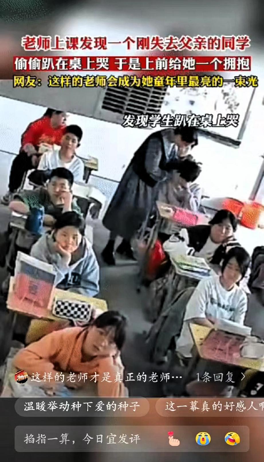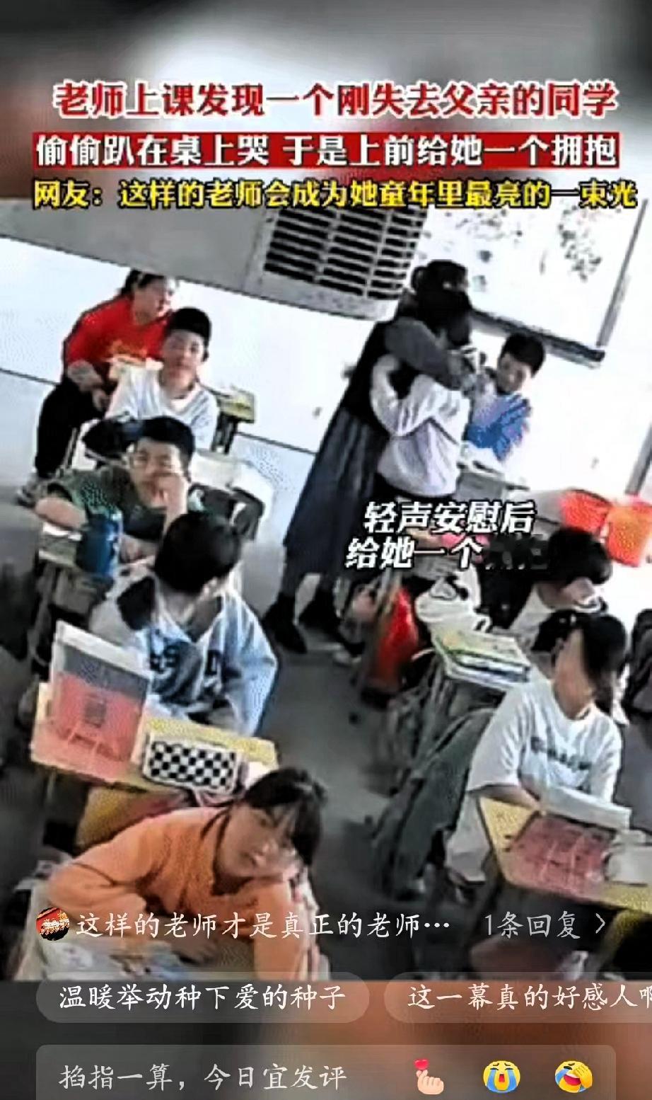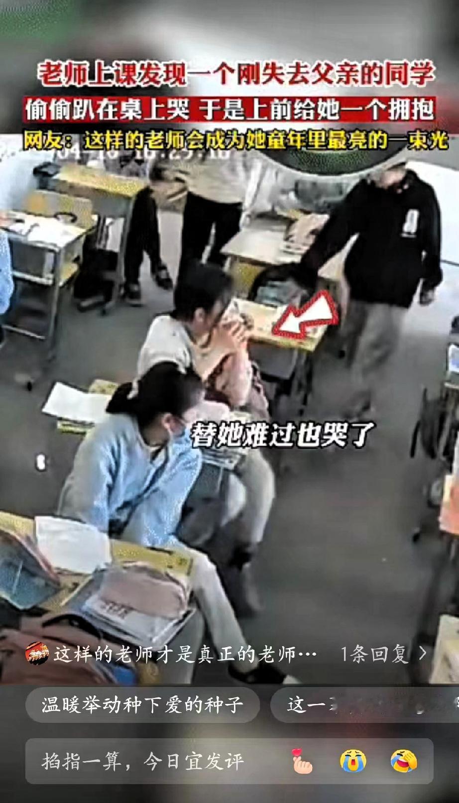 太感人了”!安徽,一位老师正在讲课,突然注意到角落里的女孩有些异常——刚失去父亲的她,把头埋在胳膊里,肩膀控制不住地颤抖,显然在偷偷落泪。 老师没有打断课堂节奏,也没有大声询问让孩子陷入尴尬,而是悄悄停下脚步,轻手轻脚走到女孩身边,俯下身用极温柔的声音安抚了几句,然后张开双臂,给了她一个稳稳的拥抱。 这个无声的拥抱,像一颗温柔的石子,在孩子们心中激起了爱的涟漪。前排的小男孩最先红了眼眶,默默起身走到女孩身边,轻轻抱了抱她的肩膀;紧接着,越来越多的同学主动围拢过来,有的递上纸巾,有的拍着她的后背,一个个稚嫩的拥抱叠在一起,把女孩紧紧裹在温暖的“小团体”里,整个教室都被善意笼罩。 没有华丽的辞藻,没有刻意的引导,老师用一个简单的拥抱,给了孩子最需要的安全感,也悄悄教会了全班同学“共情”与“善良”。这才是教育最动人的本质啊!课本知识能教会孩子如何解题,但这份发自内心的温柔与包容,能教会孩子如何爱人、如何面对世界。 那些童年里被温柔以待的瞬间,就像一束束光,会悄悄照亮孩子未来的路。当他们长大后遇到风雨,想起曾经被这样真诚地关怀过,就有了勇敢前行的底气。比起分数和名次,这种刻在骨子里的善良与温暖,才是成长路上最珍贵的财富。 你上学时有没有遇到过这样温暖的老师或同学?有没有一段被温柔呵护的回忆,至今想起仍心头一暖?