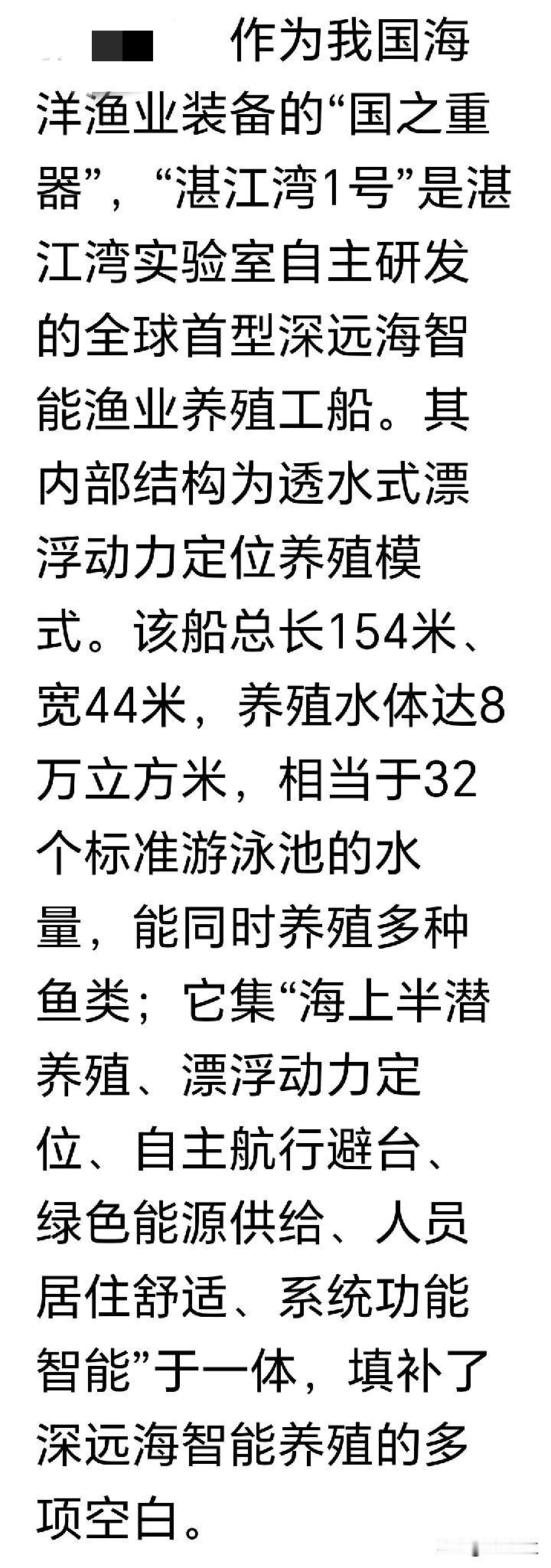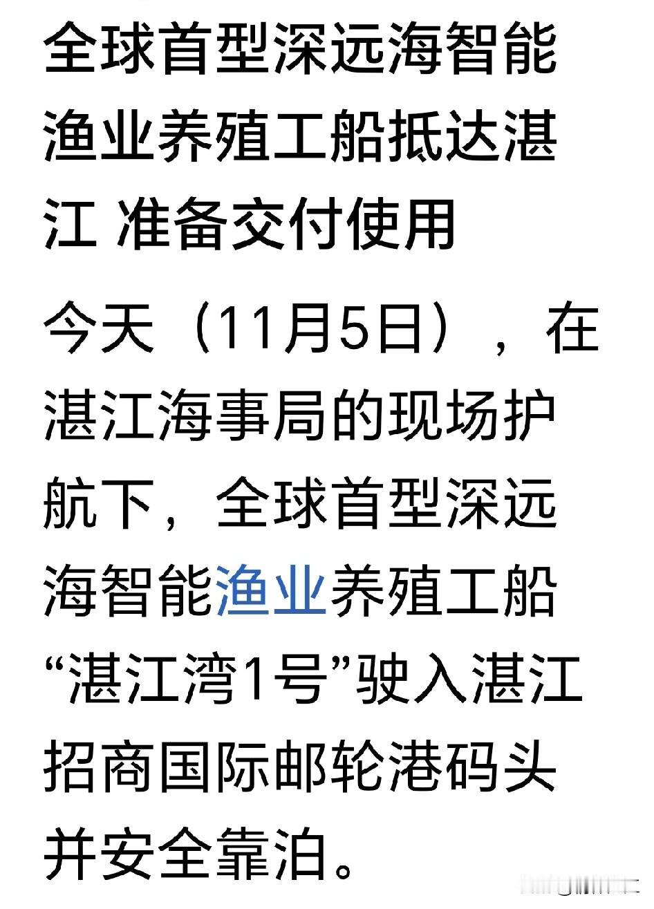 湛江新闻又上新闻联播!这一次是关于湛江的科技创新,绝对是高大上的成就。据报道,这个“湛江湾1号”是湛江湾实验室自主研发的海洋渔业装备“国之重器”,它是深远海智能养殖工船,助力湛江现代海洋经济产业高质量发展。可以预期,现在有“湛江湾1号”,以后肯定还有“湛江湾2号”“湛江湾3号”,湛江湾实验室成为湛江市科技创新的主要力量。