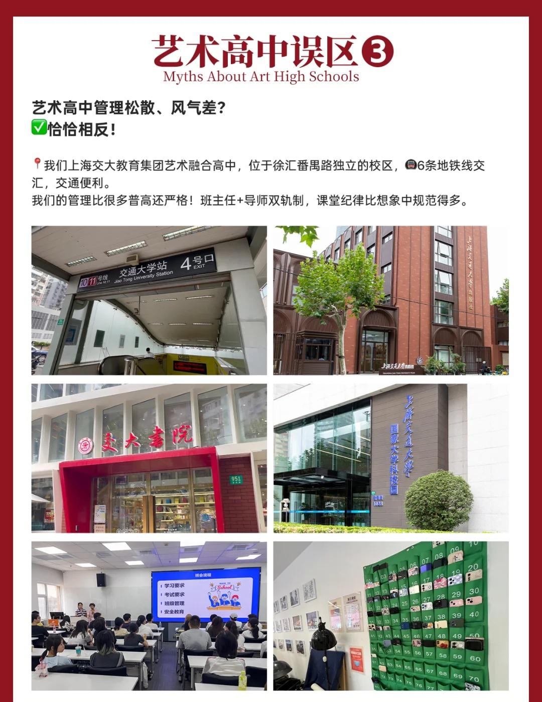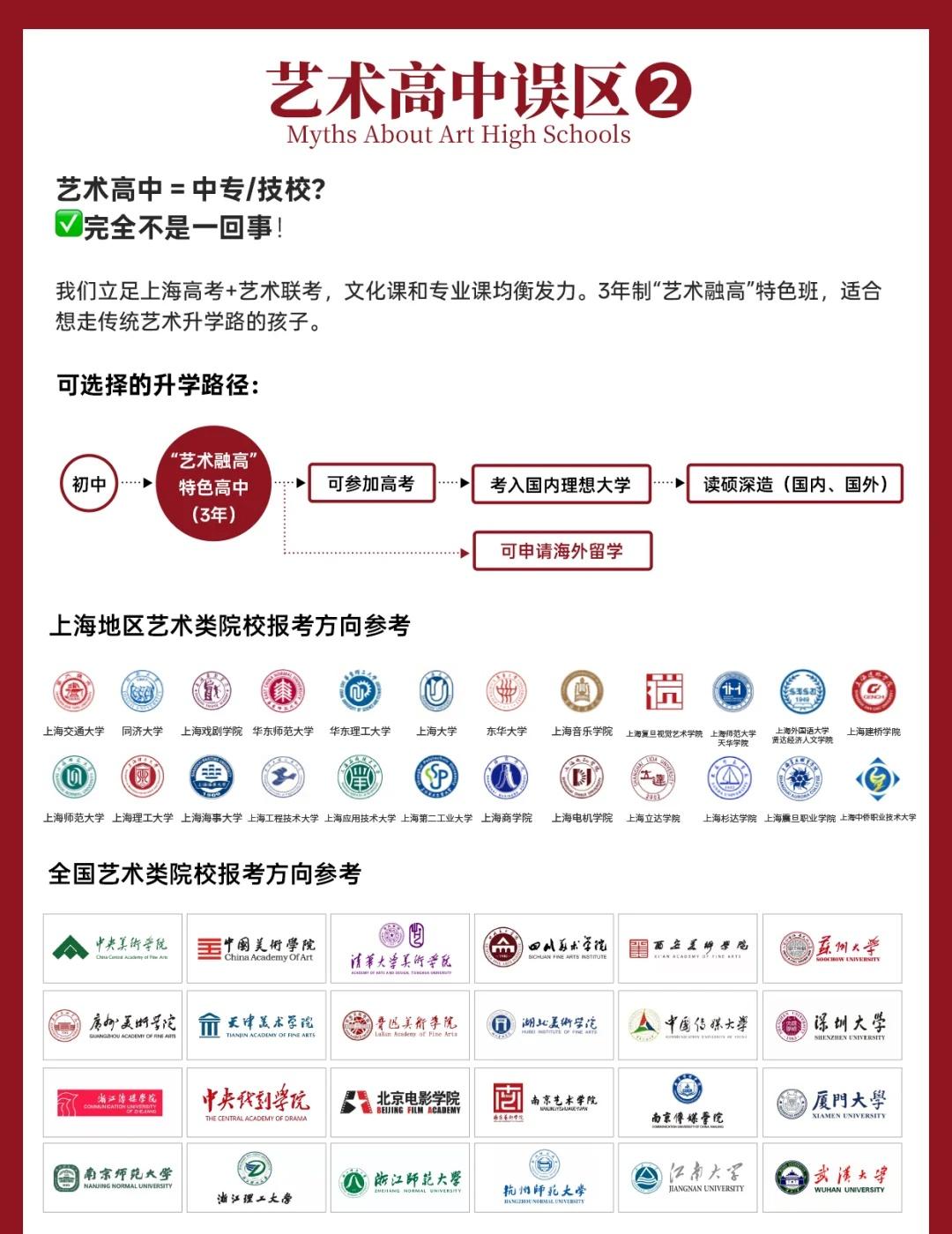 ‼️读艺术高中靠谱吗?这些误区要尽早了解 作为曾经也为孩子升学焦虑过的妈妈,今天必须为“艺术高中”正名! 💪实地探访上海交大教育集团艺术融合高中后,才发现之前踩过的坑都是信息差造成的😭 ❌误区1️⃣艺术高中不能参加普通高考? ✅大错特错! 艺术高中与普通高中学生一样能参加全国统一高考。而且参加艺考高考,文化课的分数线通常比本科线低。对于偏科娃来说,双轨升学路径,让孩子多一份选择。 经过三年艺术课+文化课并驾齐驱的学习模式,冲刺本科其实也没有那么难!中国美术学院、同济大学、上海交通大学、华东师范大学、上海大学美术学院等多所知名高校,就是至好的证明! ❌误区2️⃣ 艺术高中=中专/技校? ✅完全不是一回事! 我们立足上海高考+艺术联考,文化课和专业课均衡发力。3年制“艺术融高”特色班,适合想走传统艺术升学路的孩子。 ❌误区3️⃣ 艺术高中管理松散、风气差? ✅恰恰相反! 📍我们上海交大教育集团艺术融合高中,位于徐汇番禺路独立的校区,🚇6条地铁线交汇,交通便利。 我们的管理比很多普高还严格!班主任+导师双轨制,课堂纪律比想象中规范得多。 ❌误区4️⃣ 艺术高中只适合有基础的学生? ✅我们的课程设置针对艺术0基础也能学! 学校从素描、速写、色彩等基础课程开始教,五大热门专业循序渐进: ▪️传媒设计 ▪️网络游戏开发 ▪️动漫动画设计 ▪️AIGC设计 ▪️建筑室内设计 大多数学生都是从高一开始系统学习,重要的是对艺术的兴趣和对学习的探索欲。 稳扎稳打文化课和艺术课的内容,做到学透吃透。到高二高三进行艺术设计深度学习,更扎实! 💡哪些娃适合来这里就读? ✅工薪家庭背景,重视教育投入产出比 ✅文化课偏科,但动手能力强 ✅对艺术感兴趣,零基础也没关系 ✅沪籍、非沪籍,正在发愁升学路径 ✅想出国深造,需要国际认可的高中文凭 ✅对传统应试教育不适应,需要多元发展 交大教育集团艺术融高 多元升学途径 上海美术高中 艺术升学 中考分流 初中升学怎么选 初高中毕业生的理想选择 初三升学规划