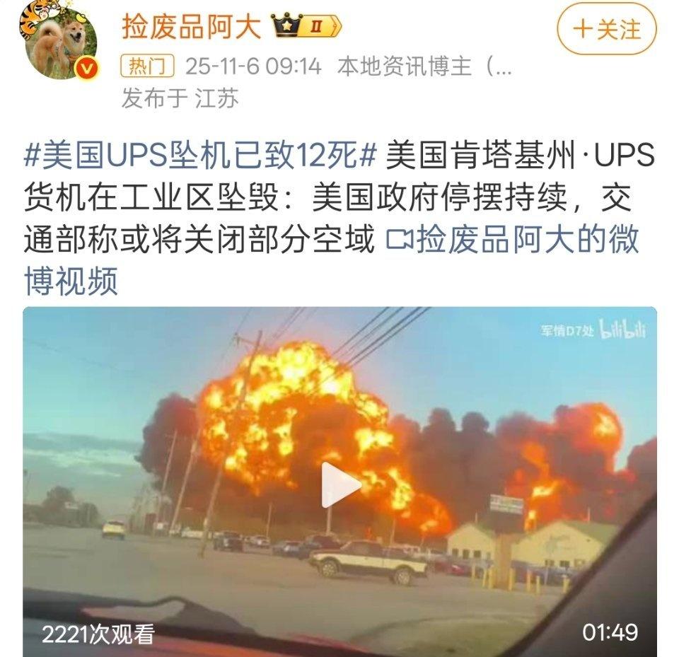 美一飞机坠毁,多消息证实。美UPS—11波音货机坠毁有人员伤亡,它是起飞后不久