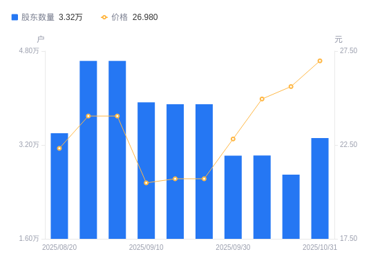 日期A股户数(户)流通A股户均持股数(股)户均持股市值(万元)2025-10-31331654403.7111.882025-10-20269395421.4713.882025-10-10302024835.7412.072025-09-30301674841.3511.052025-09-20389323751.397.772025-09-19389323751.397.772025-09-10392523720.807.622025-08-30463373151.897.582025-08-29463373151.897.582025-08-20339914296.699.59