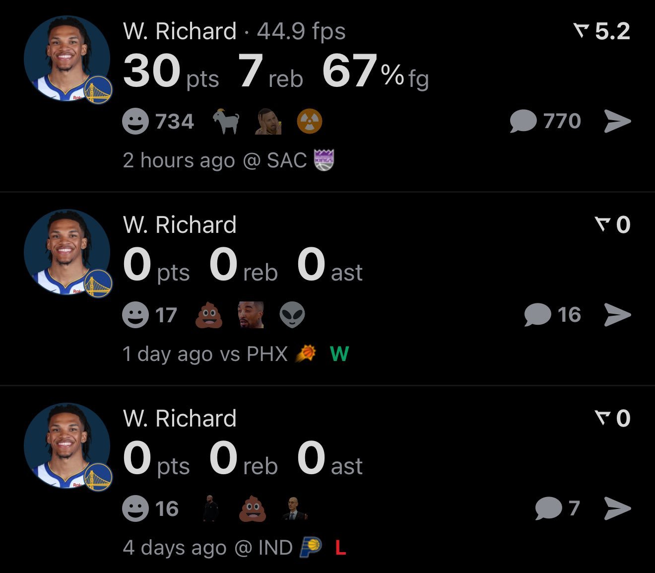 勇士今年的56号秀理查德轰下30分7篮板3助攻,15中10,三分8中5。他成为了本届新秀第二位单场砍下30+的球员,第一个是首秀的VJ。上一位单场30+的勇士新秀,是2022年的穆迪[doge]